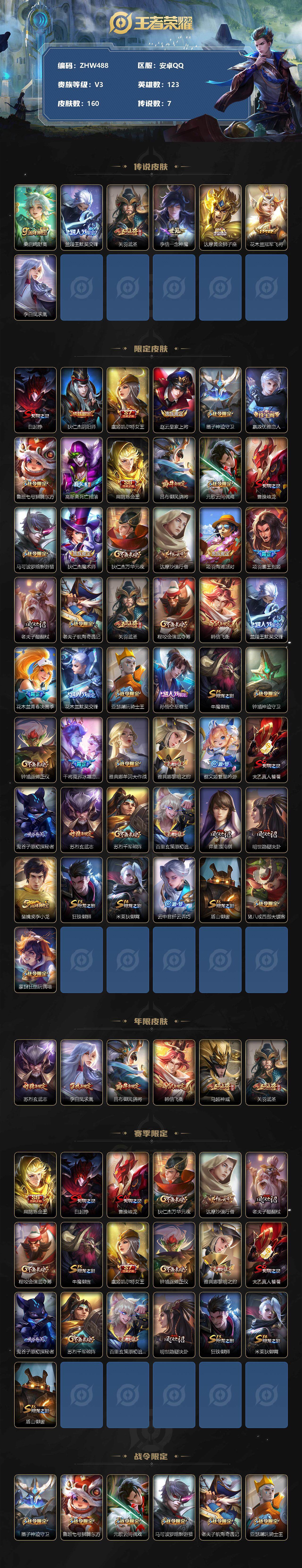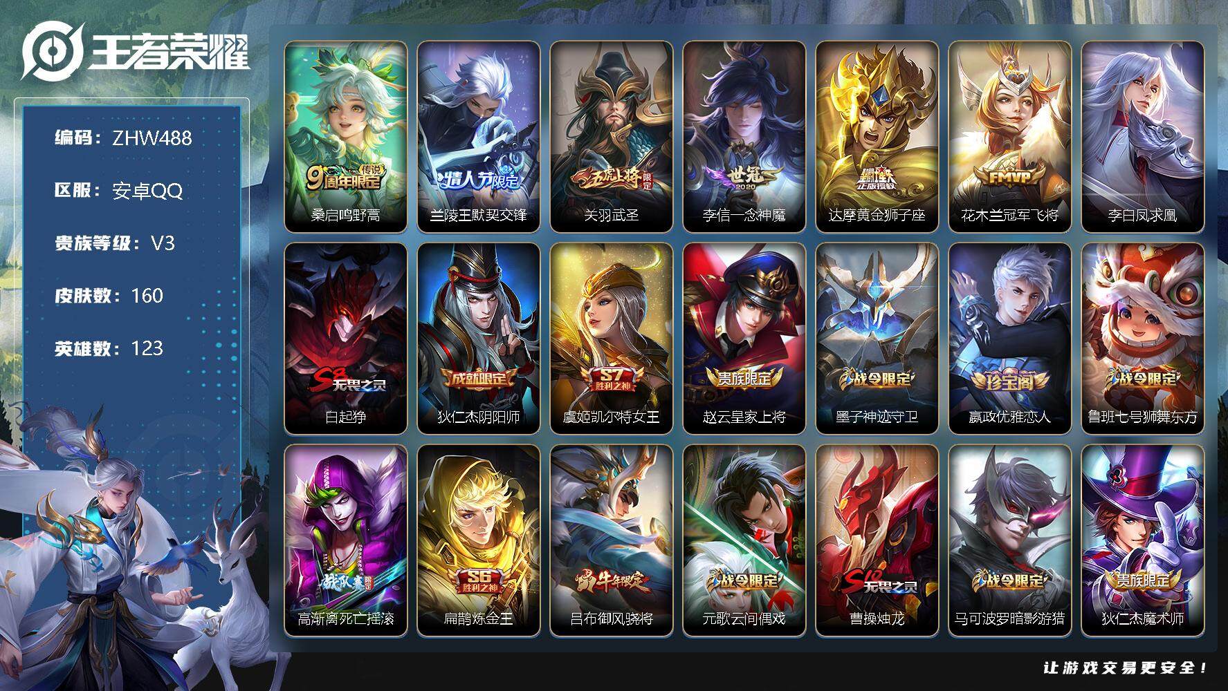 [12467337]【特价急出/详情看图】:安卓Q-V3-永恒钻石III段位-123英雄-160皮肤-7传说-48史诗