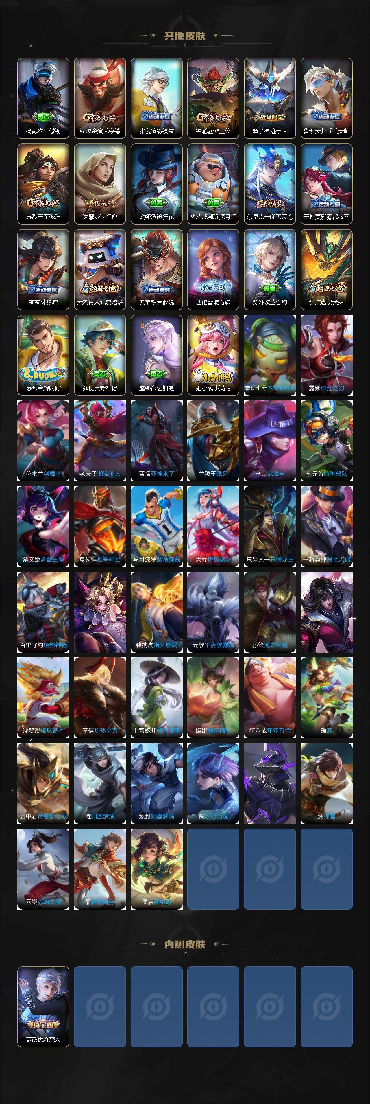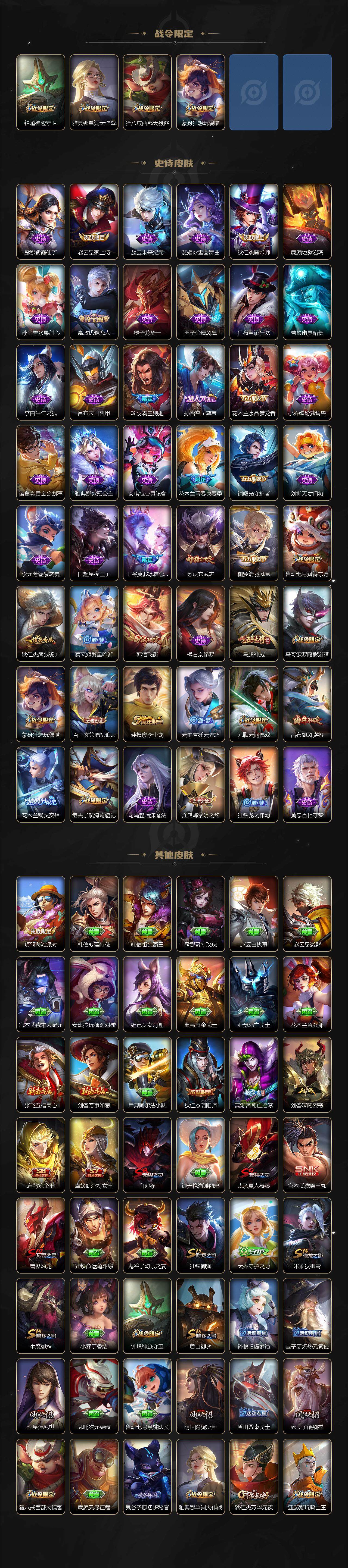 【限定皮肤】:白起狰,狄仁杰阴阳师,虞姬凯尔特女王,赵云皇家上将,墨子神迹守卫,嬴政优雅恋人,鲁班七号狮舞东方,高渐离死亡摇滚,扁鹊炼金王,吕布御风骁将,元歌云间偶戏,曹操烛龙,马可波罗暗影游猎,狄仁杰魔术师,狄仁杰万华元夜,达摩沙漠行僧,项羽海滩派对,项羽霸王别姬,老夫子醍醐杖,老夫子航海奇遇记,关羽武圣,程咬金演武夺筹,韩信飞衡,兰陵王默契交锋,花木兰青春决赛季,花木兰默契交锋,亚瑟潮玩骑士王,孙悟空至尊宝,牛魔御旌,钟馗神迹守卫,钟馗驱傩正仪,干将莫邪冰霜恋舞曲,雅典娜单词大作战,雅典娜黎明之约,蔡文姬繁星吟游,太乙真人饕餮,鬼谷子原初探秘者,苏烈玄武志,苏烈千军破阵,百里玄策原初追逐者,弈星混沌棋,明世隐疑决卦,裴擒虎李小龙,狂铁御狮,米莱狄御霄,云中君纤云弄巧,盾山御銮,猪八戒西部大镖客,蒙犽狂想玩偶喵