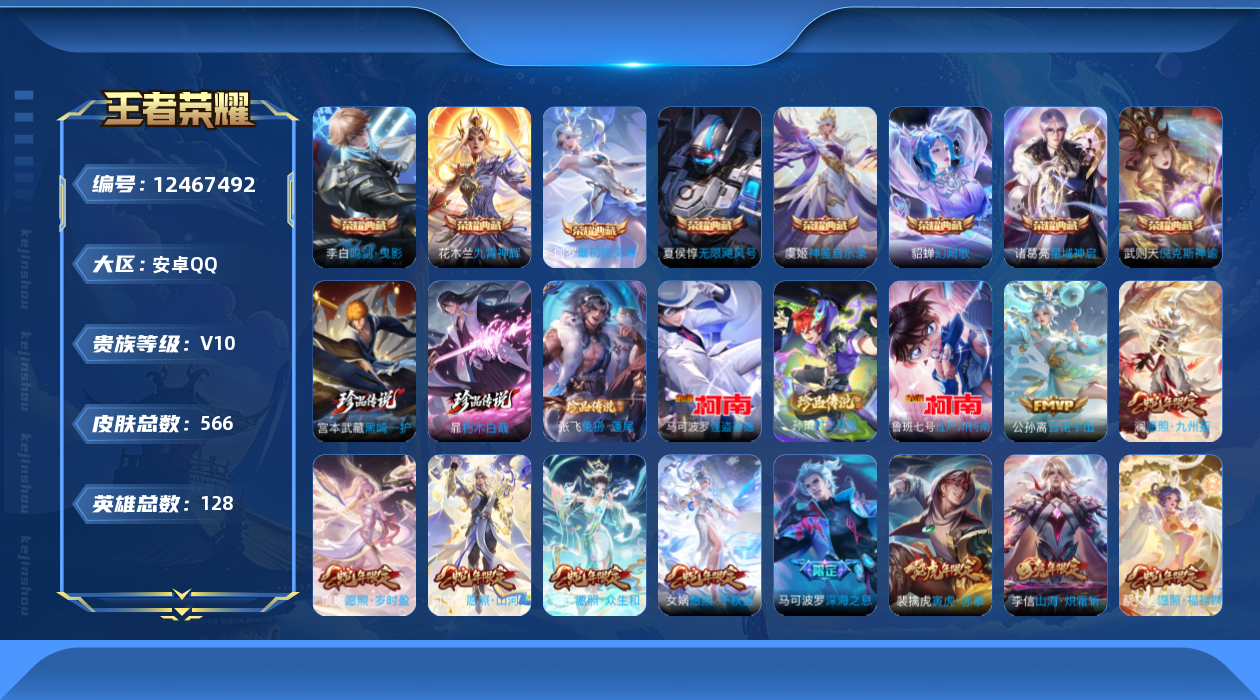 - PX_2096438-质量小号-安卓Q-可二次-贵6-123英雄-161皮肤-5传说-36史诗-53限定-3按键-贵族积分16841-营地ID:1640089435/愿照九州拓-愿照山河定-鸣野蒿-青龙志-山海玄木吟-山海炽霜斩-冰冠公主-炽阳神光-未来纪元赵云-百解令-刘备百相守梦-唤灵魅影-原初探秘者-水晶猎龙者-地狱岩魂-特工魅影-曙光守护者-特工战影-白蛇-蔷薇恋人