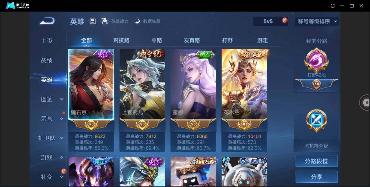 [12467492]打野42段/对抗路32段【特价急出/详情看图】:安卓Q-V10-至尊星耀V段位-127英雄-566皮肤-8典藏-6珍品传说-70传说-189史诗