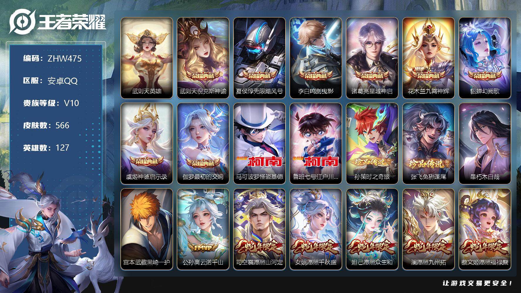 [12467492]打野42段/对抗路32段【特价急出/详情看图】:安卓Q-V10-至尊星耀V段位-127英雄-566皮肤-8典藏-6珍品传说-70传说-189史诗 【英雄全皮】:墨子全皮,嬴政全皮,刘禅全皮,高渐离全皮,白起全皮,宫本武藏全皮,达摩全皮,姜子牙全皮,刘邦全皮,艾琳全皮,娜可露露全皮,橘右京全皮,苍全皮,雅典娜全皮,太乙真人全皮,鬼谷子全皮,苏烈全皮,梦奇全皮,沈梦溪全皮,狂铁全皮,米莱狄全皮,李信全皮,盾山全皮,猪八戒全皮,鲁班大师全皮,蒙恬全皮,阿古朵全皮,桑启全皮,夏洛特全皮,司空震全皮,金蝉全皮,赵怀真全皮,戈娅全皮,空空儿全皮,影全皮,海诺全皮 【荣耀典藏】:武则天英雄,武则天倪克斯神谕,夏侯惇无限飓风号,李白鸣剑曳影,诸葛亮星域神启,花木兰九霄神辉,貂蝉幻阙歌,虞姬神鉴启示录,伽罗最初的交响 【珍品传说】:马可波罗怪盗基德,鲁班七号江户川柯南,孙策时之奇旅,张飞兔狲蓬尾,暃朽木白哉,宫本武藏黑崎一护 【传说皮肤】:公孙离云诺千山,司空震愿照山河定,女娲愿照千秋盛,妲己愿照众生和,澜愿照九州拓,蔡文姬愿照福禄聚,虞姬愿照岁时盈,云缨幻光神枪,裴擒虎祥瑞亨通,嬴政玄雷天君,王昭君映山客,桑启鸣野蒿,庄周牧神诗旅,朵莉亚心动手记,墨子黄金天蝎座,艾琳觅芳踪,甄姬至美化雀舞,大乔时之奇旅,吕布遇见神鼓,宫本武藏惊梅引,云缨鹤归松栖,东皇太一灼幽烈阳,夏洛特浮生妄,花木兰燃星之曲,李信山海炽霜斩,吕布怒海麟威,李白诗剑行,不知火舞绯月行,王昭君星穹之声,橘右京枫霜尽,娜可露露前尘镜,马可波罗深海之息,马超无双飞将,孙策挚爱之约,女娲补天,孙策末日机甲,裴擒虎寅虎赤拳,鲁班七号寅虎瑞焰,孙尚香异界灵契,貂蝉遇见胡旋,赵云淬星耀世,王昭君乞巧织情,西施游龙清影,周瑜音你心动,小乔音你心动,李元芳飞鸢探春,铠绛天战甲,镜炽阳神光,虞姬启明星使,孙悟空零号赤焰,关羽武圣,曜云鹰飞将,李信一念神魔,刘备时之恋人,伽罗太华,貂蝉猫影幻舞,张良黄金白羊座,干将莫邪久胜战神,虞姬云霓雀翎,达摩黄金狮子座,花木兰冠军飞将,梦奇胖达荣荣,后羿黄金射手座,貂蝉仲夏夜之梦,孙尚香末日机甲,宫本武藏地狱之眼,孙悟空地狱火,吕布天魔缭乱,武则天海洋之心,狄仁杰超时空战士 【限定皮肤】:白起狰,大乔绒语心约,虞姬夏日便利店,姜子牙天穹之誓,杨戬破阵退雄兵,李白谪仙醉月,狄仁杰阴阳师,虞姬凯尔特女
