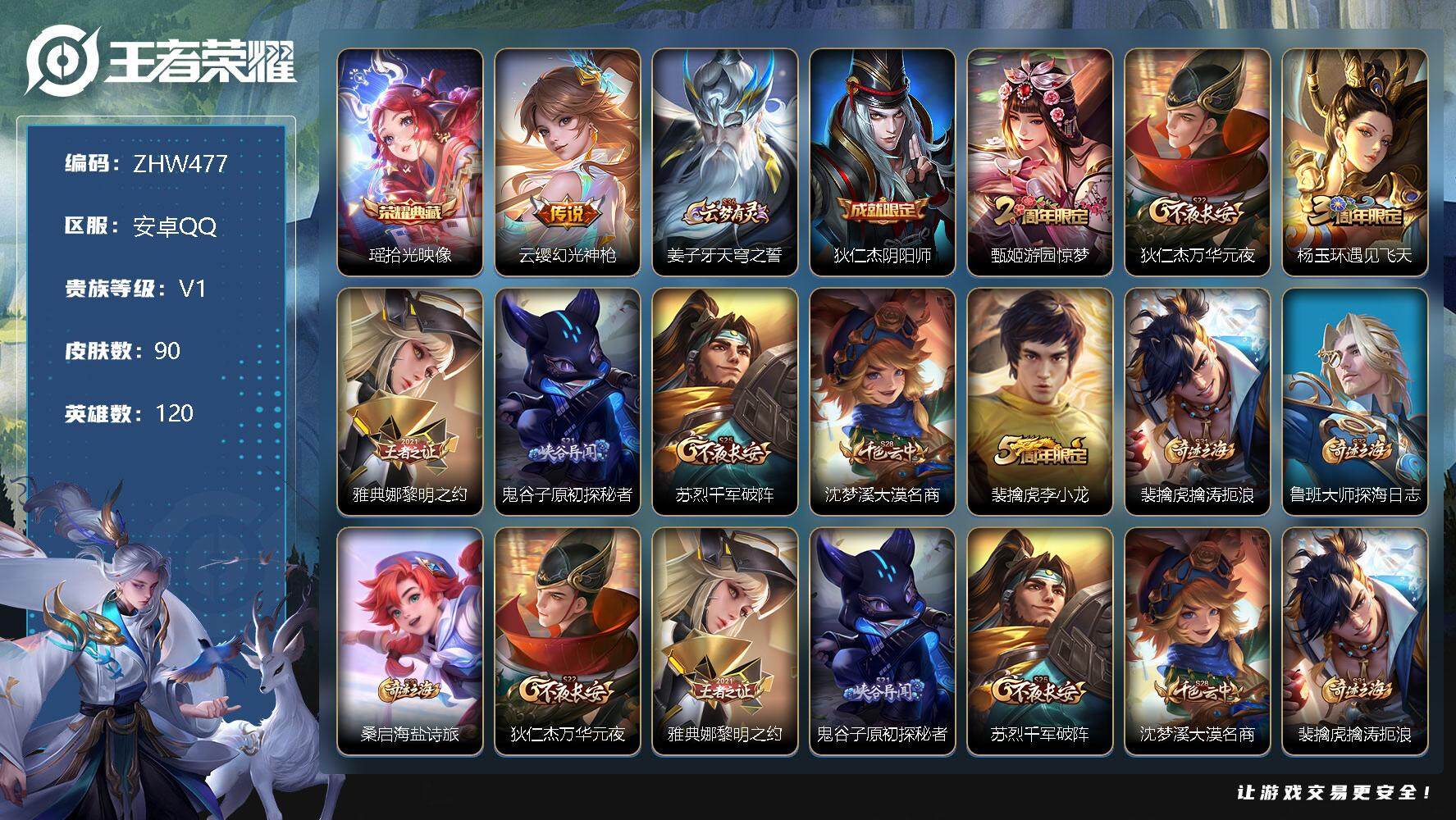 [12467533]【商品标题】:安卓Q-V1-至尊星耀II段位-120英雄-90皮肤-1典藏-0珍品无双-0无双-0珍品传说-1传说-26史诗