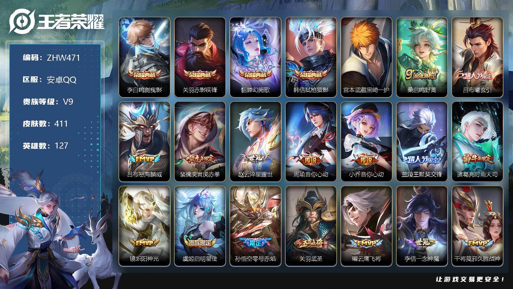 [12467460]【商品标题】:安卓Q-V9-至尊星耀II段位-127英雄-411皮肤-4典藏-0珍品无双-0无双-1珍品传说-22传说-128史诗
