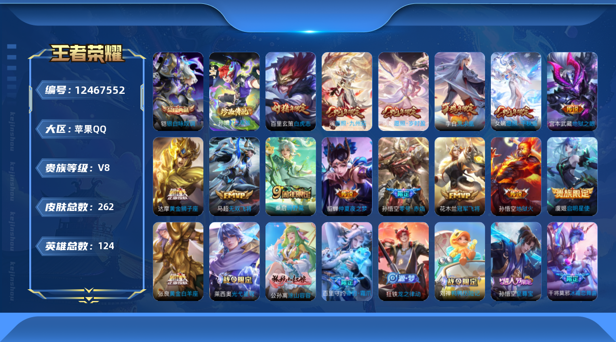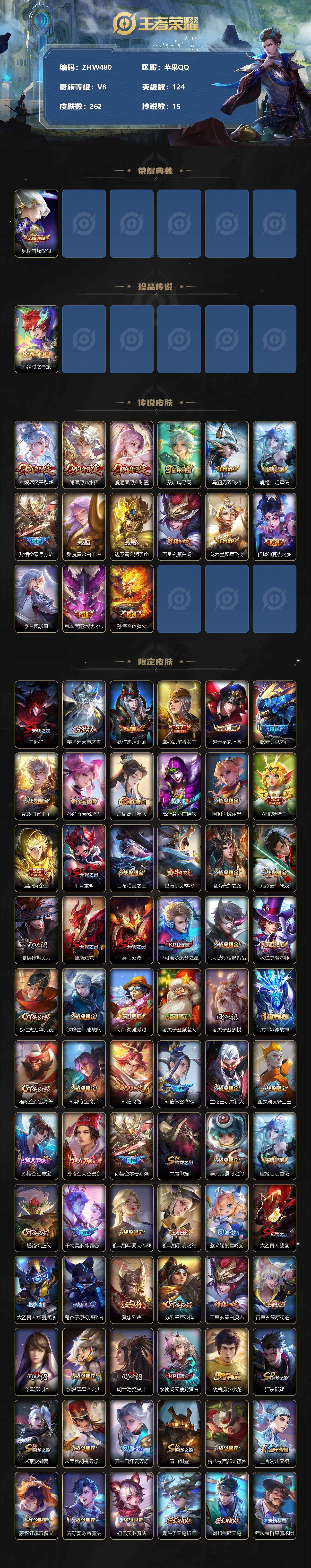 [12467552]【特价急出/详情看图】:苹果Q-V8-永恒钻石III段位-124英雄-262皮肤-1典藏-1珍品传说-15传说-68史诗
