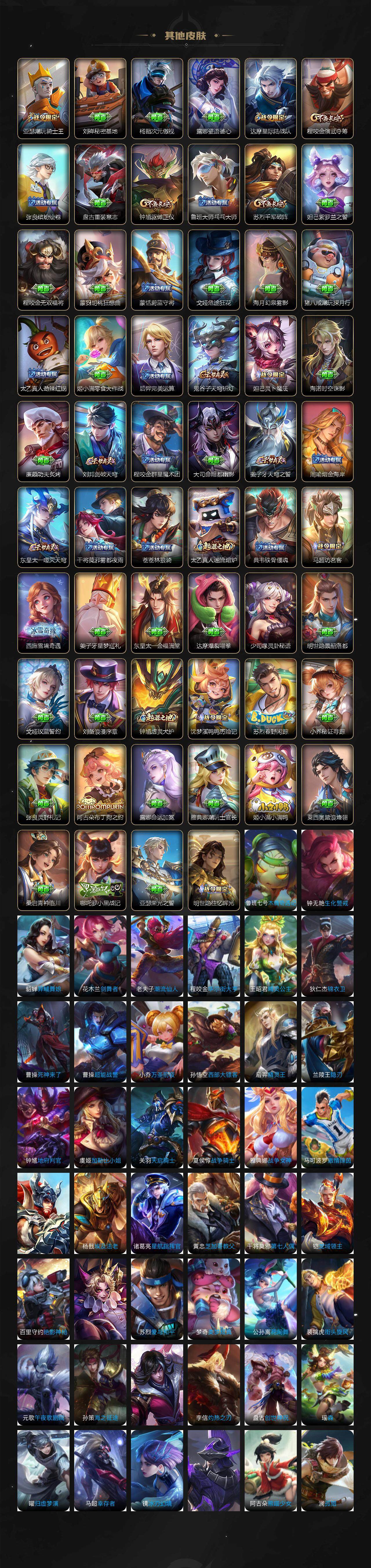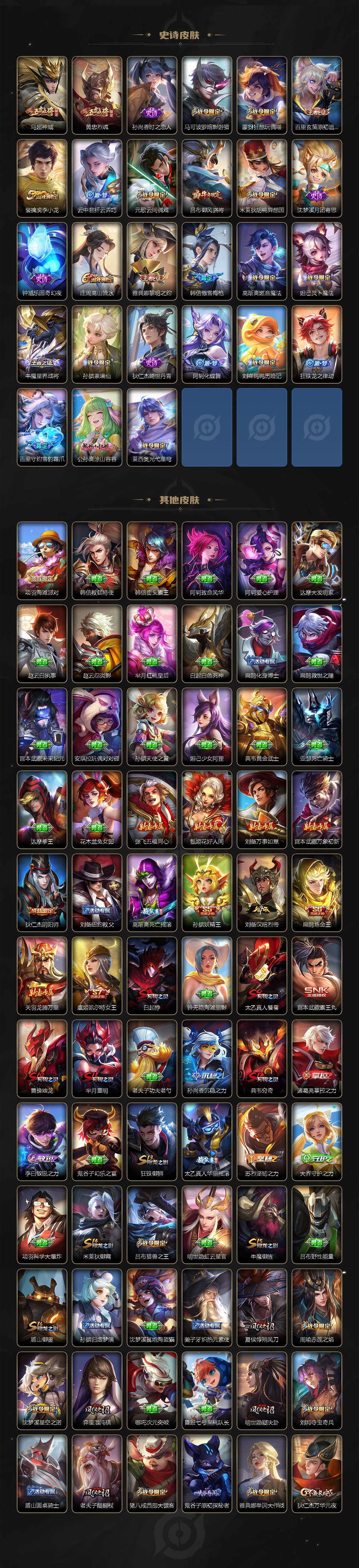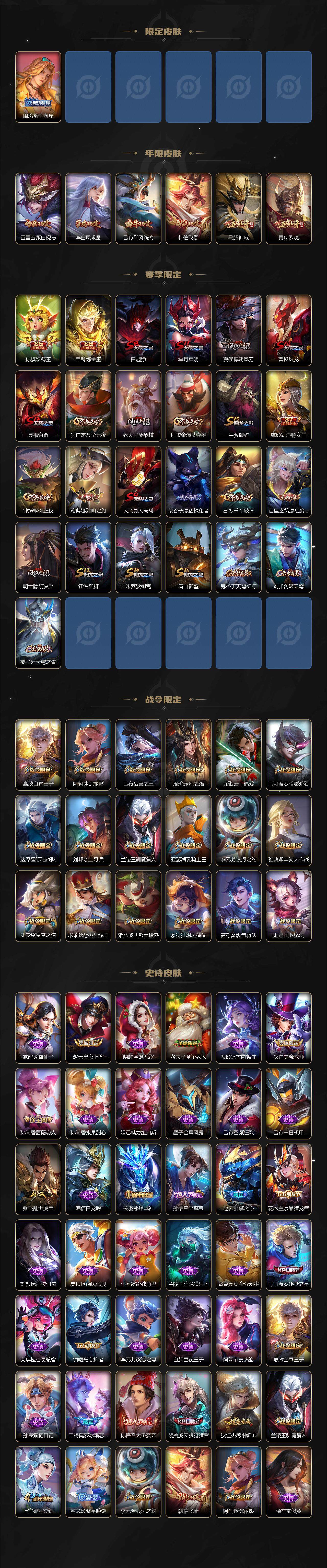 【限定皮肤】:白起狰,姜子牙天穹之誓,狄仁杰阴阳师,虞姬凯尔特女王,赵云皇家上将,赵云引擎之心,嬴政白昼王子,孙尚香蔷薇恋人,庄周高山流水,高渐离死亡摇滚,阿轲迷踪丽影,孙膑妖精王,扁鹊炼金王,芈月重明,吕布猎兽之王,吕布御风骁将,周瑜赤莲之焰,元歌云间偶戏,夏侯惇朔风刀,曹操烛龙,典韦穷奇,马可波罗逐梦之星,马可波罗暗影游猎,狄仁杰魔术师,狄仁杰万华元夜,达摩星际陆战队,项羽海滩派对,老夫子圣诞老人,老夫子醍醐杖,关羽冰锋战神,程咬金演武夺筹,刘邦夺宝奇兵,韩信飞衡,韩信傲雪梅枪,兰陵王驯魔猎人,亚瑟潮玩骑士王,孙悟空至尊宝,孙悟空大圣娶亲,孙悟空零号赤焰,牛魔御旌,李元芳银河之约,虞姬启明星使,钟馗驱傩正仪,干将莫邪冰霜恋舞曲,雅典娜单词大作战,雅典娜黎明之约,蔡文姬繁星吟游,太乙真人饕餮,太乙真人华丽摇滚,鬼谷子原初探秘者,黄忠烈魂,苏烈千军破阵,百里玄策白虎志,百里玄策原初追逐者,弈星混沌棋,沈梦溪星空之诺,明世隐疑决卦,裴擒虎天狼狩猎者,裴擒虎李小龙,狂铁御狮,米莱狄御霄,米莱狄胡桃异想国,云中君纤云弄巧,盾山御銮,猪八戒西部大镖客,上官婉儿梁祝,蒙犽狂想玩偶喵,高渐离燃音魔法,妲己灵卜魔法,鬼谷子天穹祈灯,刘邦剑破天穹,程咬金群星魔术团,周瑜熔金海岸