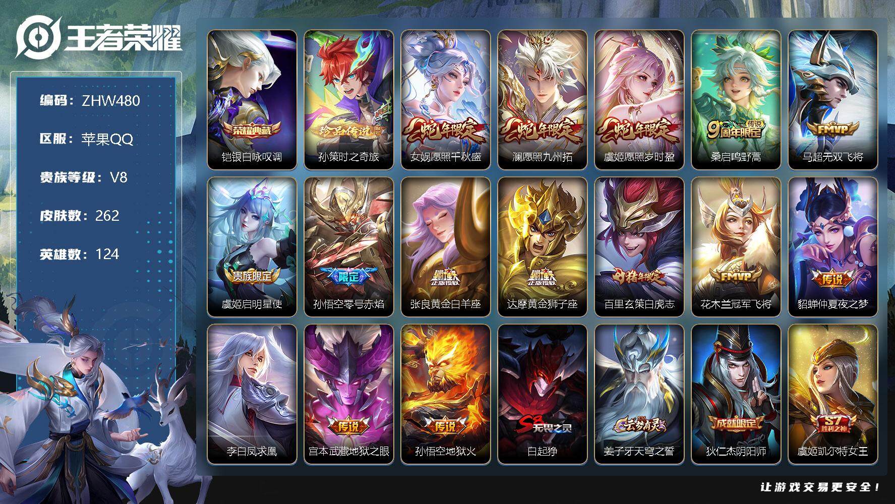 [12467552]【特价急出/详情看图】:苹果Q-V8-永恒钻石III段位-124英雄-262皮肤-1典藏-1珍品传说-15传说-68史诗 【荣耀典藏】:铠银白咏叹调 【珍品传说】:孙策时之奇旅 【传说皮肤】:女娲愿照千秋盛,澜愿照九州拓,虞姬愿照岁时盈,桑启鸣野蒿,马超无双飞将,虞姬启明星使,孙悟空零号赤焰,张良黄金白羊座,达摩黄金狮子座,百里玄策白虎志,花木兰冠军飞将,貂蝉仲夏夜之梦,李白凤求凰,宫本武藏地狱之眼,孙悟空地狱火 【限定皮肤】:白起狰,姜子牙天穹之誓,狄仁杰阴阳师,虞姬凯尔特女王,赵云皇家上将,赵云引擎之心,嬴政白昼王子,孙尚香蔷薇恋人,庄周高山流水,高渐离死亡摇滚,阿轲迷踪丽影,孙膑妖精王,扁鹊炼金王,芈月重明,吕布猎兽之王,吕布御风骁将,周瑜赤莲之焰,元歌云间偶戏,夏侯惇朔风刀,曹操烛龙,典韦穷奇,马可波罗逐梦之星,马可波罗暗影游猎,狄仁杰魔术师,狄仁杰万华元夜,达摩星际陆战队,项羽海滩派对,老夫子圣诞老人,老夫子醍醐杖,关羽冰锋战神,程咬金演武夺筹,刘邦夺宝奇兵,韩信飞衡,韩信傲雪梅枪,兰陵王驯魔猎人,亚瑟潮玩骑士王,孙悟空至尊宝,孙悟空大圣娶亲,孙悟空零号赤焰,牛魔御旌,李元芳银河之约,虞姬启明星使,钟馗驱傩正仪,干将莫邪冰霜恋舞曲,雅典娜单词大作战,雅典娜黎明之约,蔡文姬繁星吟游,太乙真人饕餮,太乙真人华丽摇滚,鬼谷子原初探秘者,黄忠烈魂,苏烈千军破阵,百里玄策白虎志,百里玄策原初追逐者,弈星混沌棋,沈梦溪星空之诺,明世隐疑决卦,裴擒虎天狼狩猎者,裴擒虎李小龙,狂铁御狮,米莱狄御霄,米莱狄胡桃异想国,云中君纤云弄巧,盾山御銮,猪八戒西部大镖客,上官婉儿梁祝,蒙犽狂想玩偶喵,高渐离燃音魔法,妲己灵卜魔法,鬼谷子天穹祈灯,刘邦剑破天穹,程咬金群星魔术团,周瑜熔金海岸 【年限皮肤】:百里玄策白虎志,李白凤求凰,吕布御风骁将,韩信飞衡,马超神威,黄忠烈魂 【赛季限定】:孙膑妖精王,扁鹊炼金王,白起狰,芈月重明,夏侯惇朔风刀,曹操烛龙,典韦穷奇,狄仁杰万华元夜,老夫子醍醐杖,程咬金演武夺筹,牛魔御旌,虞姬凯尔特女王,钟馗驱傩正仪,雅典娜黎明之约,太乙真人饕餮,鬼谷子原初探秘者,苏烈千军破阵,百里玄策原初追逐者,弈星混沌棋,明世隐疑决卦,狂铁御狮,米莱狄御霄,盾山御銮,鬼谷子天穹祈灯,刘邦剑破天穹,姜子牙天穹之誓 【战令限定】:嬴政白昼王子,阿轲迷踪丽影,吕布猎兽之