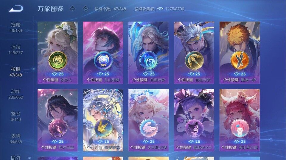 亚瑟狮心王,庄周蜃楼王,孙膑妖精王,扁鹊炼金王,虞姬凯尔特女王,白起狰,太乙真人饕餮,曹操烛龙,芈月重明,典韦穷奇,狂铁御狮,米莱狄御霄,牛魔御旌,盾山御銮,夏侯惇朔风刀,明世隐疑决卦,老夫子醍醐杖,鬼谷子原初探秘者,狄仁杰万华元夜,程咬金演武夺筹,钟馗驱傩正仪,苏烈千军破阵,吕布猎兽之王,嬴政白昼王子,女娲朔望之晖,典韦蓝屏警告,钟馗神迹守卫,鲁班七号狮舞东方,沈梦溪星空之诺,李元芳银河之约,马可波罗暗影游猎,蒙犽狂想玩偶喵,元歌云间偶戏,弈星混沌棋,达摩沙漠行僧,兰陵王金庭之子,沈梦溪大漠名商,李元芳云中旅人,桑启海盐诗旅,裴擒虎擒涛扼浪,鲁班大师探海日志,张良古海寻踪,项羽苍威无极,镜青焰无极