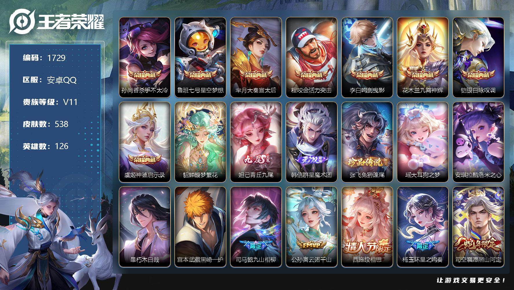 [12477181]【商品标题】:安卓Q-V11-永恒钻石II段位-126英雄-538皮肤-8典藏-1珍品无双-2无双-5珍品传说-59传说-180史诗