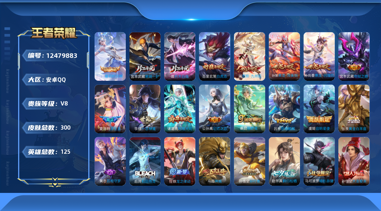 - [11445918]V7 1典藏 2无双 1珍品传说 15传说 125英雄 294皮肤 可修改实名 优质装备:弑枪猎影(韩信典藏),离恨烟(公孙离无双),器灵·螭龙剑,怪盗基德,黄金射手座,炽阳神光,云霓雀翎,仲夏夜之梦(大飞蛾),地狱之眼,李逍遥,淬星耀世,超时空战士-狄仁杰,无双飞将,画中仙,妄想实况,澜逐花归海 传说皮:幻光神枪 珍宝阁皮:万物之道,蔷薇恋人 限定皮:愿照·九州拓(澜年限),逐霄战戟,陌上桑,鸣野蒿,至尊宝,傲雪梅枪,遇见飞天,五谷丰年,青龙志(铠年限),游园惊梦,梁祝,逐梦之星,天狼溯光者,李小龙,圣诞老人,孙行者,时之奇旅-妲己 史诗皮:器灵·浮梦炉,化蝶舞,龙之律动,百相守梦-周瑜,茶境仙,海诺心动手记,破空之剑,战舞者,东方月初,谪仙醉月,百相守梦-百里守约,百相守梦-黄忠,紫霞仙子,电玩小子(小书包),白龙吟,特工魅影,百相守梦(关羽),电玩·爆裂旋风,江河有灵,蒙恬荣光圣徽,偶像歌手,龙骑士(小龙虾),暗夜猫娘,魅语,青蛇,末日机甲-吕布,猫狗日记-孙策,乱世虎臣,节奏热浪,摇滚巨星,水果甜心,绅士熊喵,星夜王子,心灵骇客,功夫厨神,德古拉伯爵,暗隐猎兽者,幽灵船长,鬼剑武藏,暗渊魔法,心灵战警,乐园奇幻夜,舞动绿茵,地狱岩魂,诗语江南,缤纷独角兽,乘风破浪,逐浪之夏,月团寄思,水晶猎龙者,曙光守护者,金属风暴,原初追逐者,圣诞狂欢,圣诞恋歌,鹰眼统帅,魅力维加斯,黎明之约,赏金猎手,千筹问战,无心