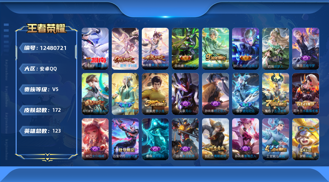 [12480721]【商品标题】:安卓Q-V5-最强王者段位-123英雄-172皮肤-0典藏-0珍品无双-0无双-1珍品传说-5传说-35史诗