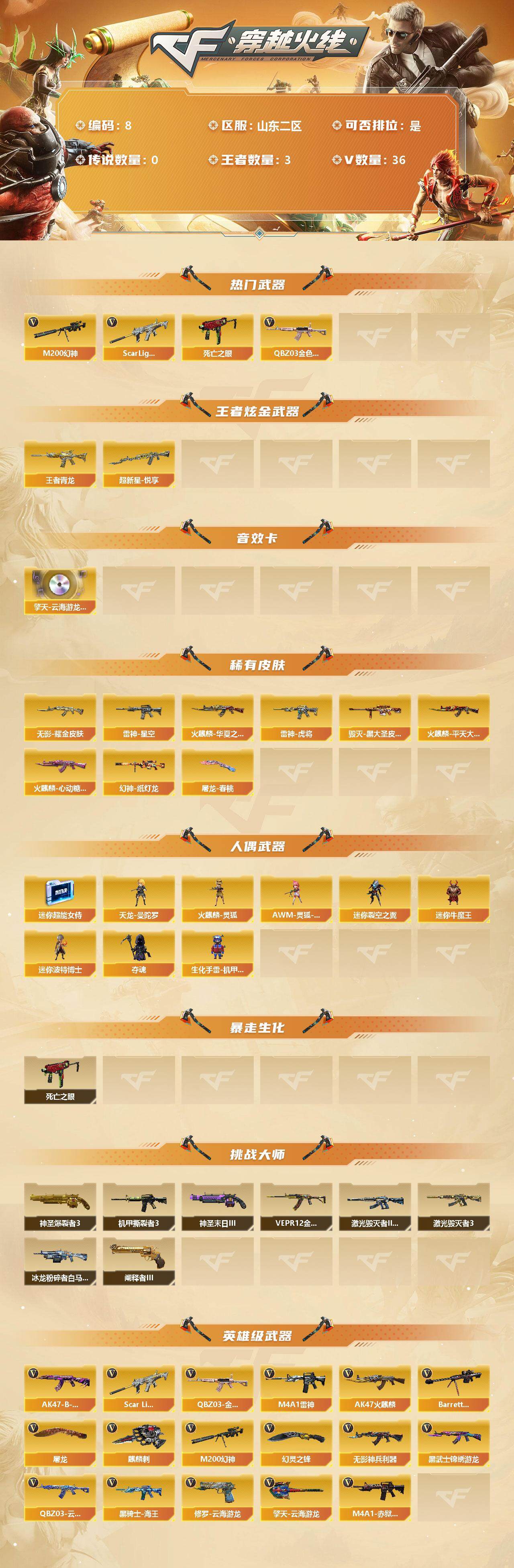 [12481211]【8】36V/100级/元帅/3王者/QBZ03-金色蔷薇/Scar Light-白虎/M200-幻神/死亡之眼/超新星-悦享/王者青龙/擎天-云海游龙音效卡/幻神-纸灯龙皮肤/雷神-星空/雷神-虎将/火麒麟-华夏之心/火麒麟-平天大圣/火麒麟-心动糖果/毁灭-黑大圣皮肤/无影耀金皮肤/屠龙-春桃/天龙-曼陀罗/火麒麟-灵狐/AWM-灵狐-15周年嘉年华/迷你超能女侍/迷你裂空之翼/迷你牛魔王/迷你波特博士/夺魂/生化手雷-机甲核心/神圣爆裂者/机甲撕裂者/神圣爆裂者-末日/阐释者/激光毁灭者/VEPR-12-金魔/激光毁灭者III-白马银枪/冰龙粉碎者-白马银枪/QBZ03-云龙/幻灵之锋/无影-神兵利器/M4A1-雷神/AK47-火麒麟/Barrett-毁灭/AK47-黑武士-锦绣游龙/黑骑士-海王/AK47-B-常胜将军/M4A1-赤狱骑士/修罗-云海游龙/麒麟刺/屠龙/擎天-云海游龙