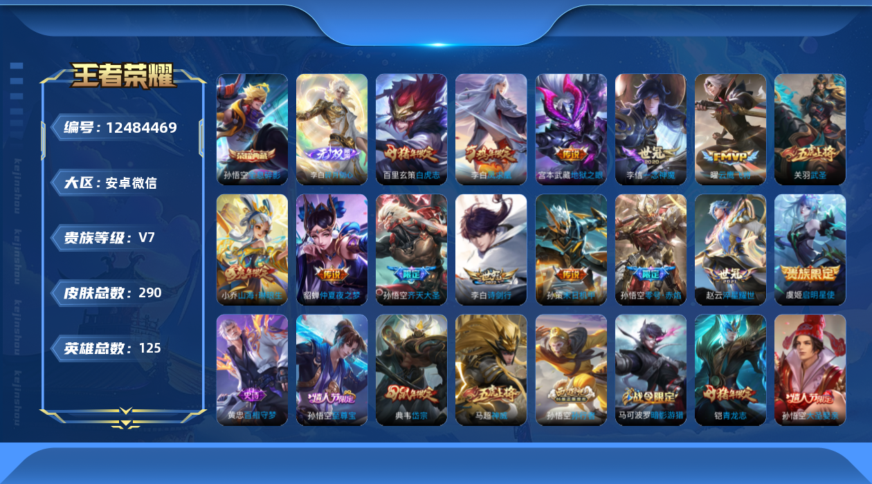 [12484469]【商品标题】:安卓WX-V7-最强王者段位-126英雄-290皮肤-1典藏-0珍品无双-1无双-0珍品传说-14传说-81史诗