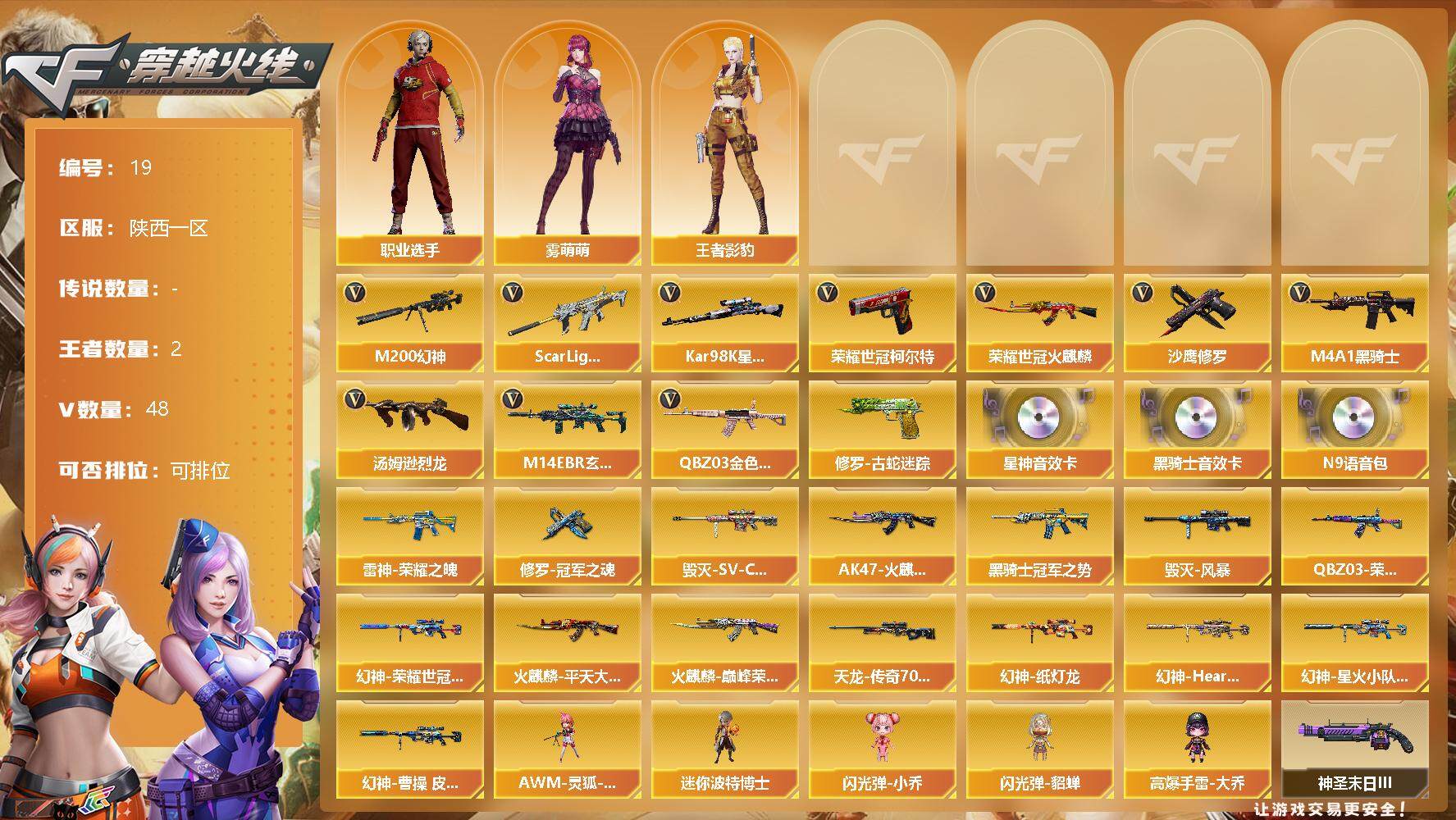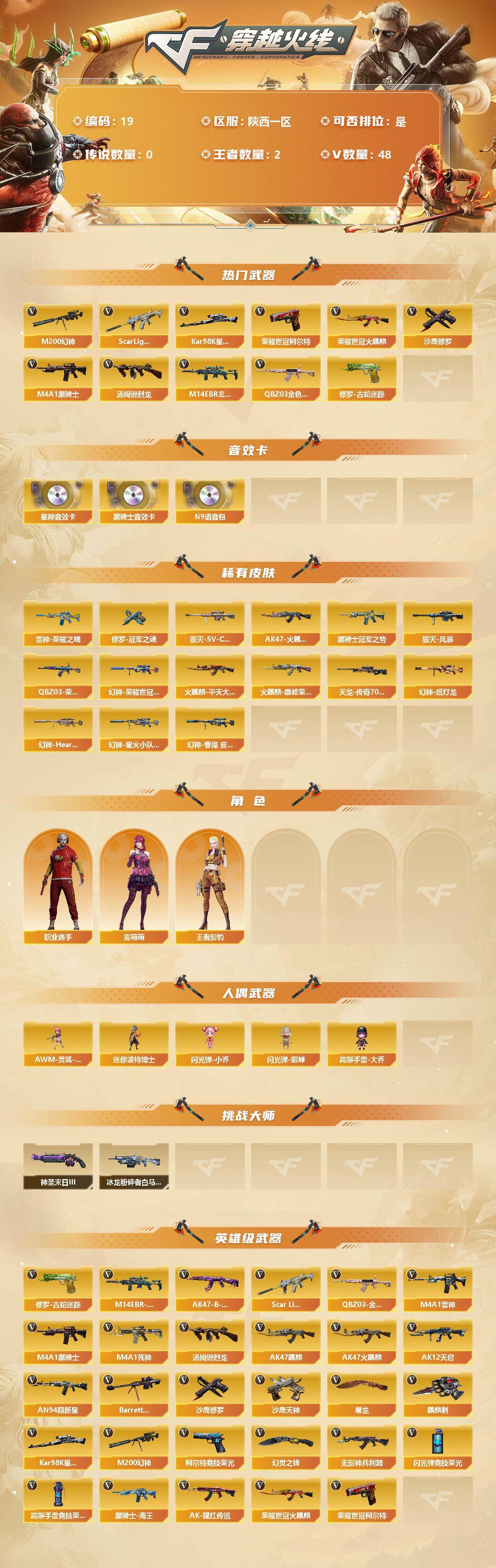 [12484587]【19】47V/100级/元帅/2王者/1英雄/QBZ03-金色蔷薇/M14EBR-玄武/Scar Light-白虎/M200-幻神/修罗-古蛇迷踪/火麒麟-荣耀世冠/柯尔特-荣耀世冠/Kar98k-星神/M4A1-黑骑士/汤姆逊-烈龙/沙鹰-修罗/M4A1-黑骑士音效卡/星神音效卡/N9语音包/M200-幻神-荣耀世冠白鲨/幻神-纸灯龙皮肤/幻神-Heartshot/幻神-星火小队签名臻藏版/幻神-曹操/QBZ03-荣耀世冠白鲨/雷神荣耀之魄/AK47-火麒麟-传奇EVEN/火麒麟-平天大圣/火麒麟-巅峰荣耀/黑骑士-冠军之势/毁灭-CFPLS16皮肤/毁灭-风暴/AWM-天龙-传奇70KG/修罗-冠军之魂/王者影豹/雾萌萌/职业选手/AWM-灵狐-15周年嘉年华/迷你波特博士/闪光弹-小乔/闪光弹-貂蝉/高爆手雷-大乔/神圣爆裂者-末日/冰龙粉碎者-白马银枪/柯尔特-竞技荣光/高爆手雷-竞技荣光/闪光弹-竞技荣光/幻灵之锋/荣耀世冠-火麒麟/荣耀世冠-柯尔特/无影-神兵利器/M4A1-雷神/M4A1-死神/AK47-麒麟/AK47-火麒麟/AK12-天启/AN94-超新星/Barrett-毁灭/黑骑士-海王/AK-47-猩红传说/AK47-B-常胜将军/沙鹰-天神/麒麟刺/屠龙