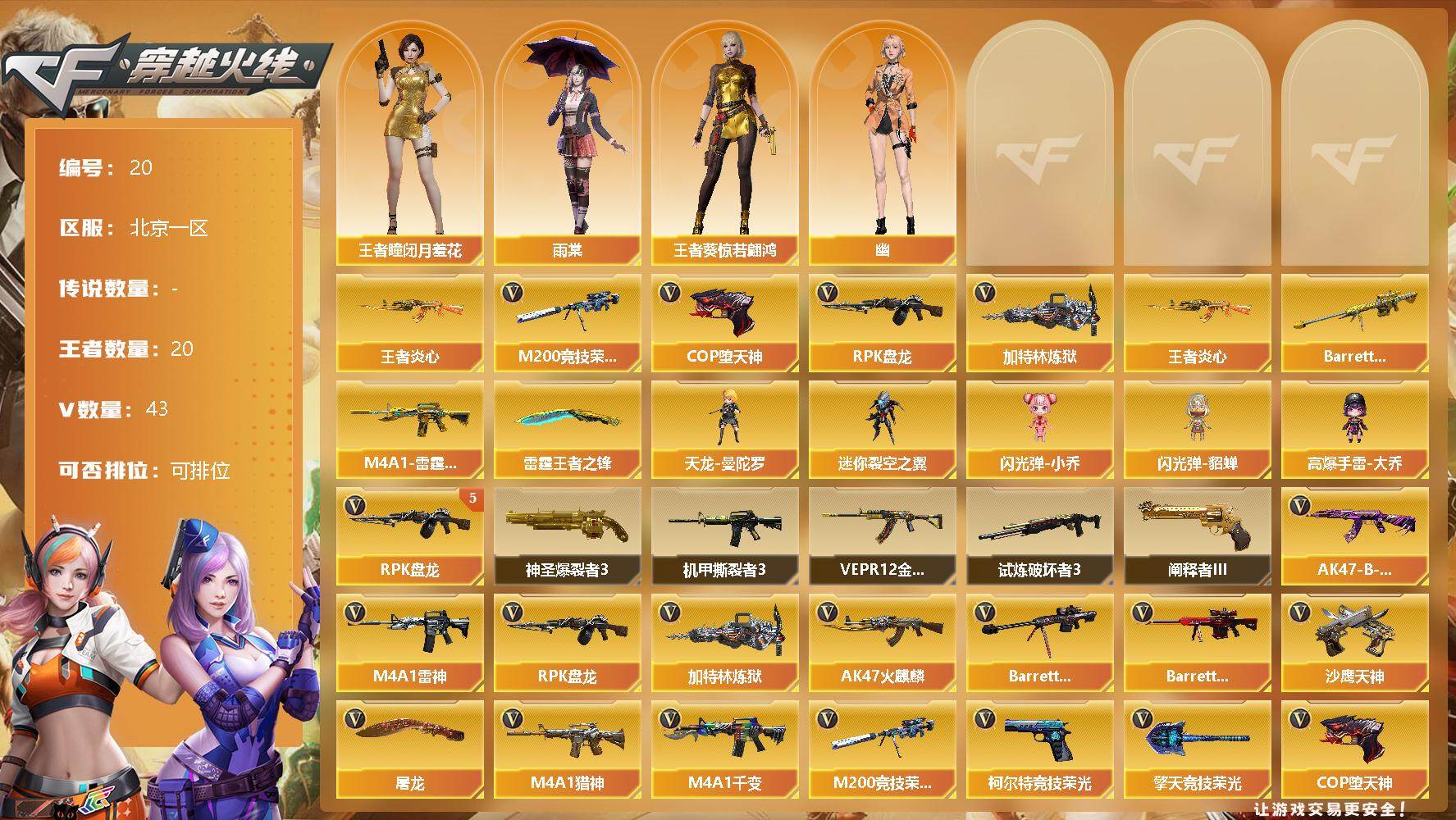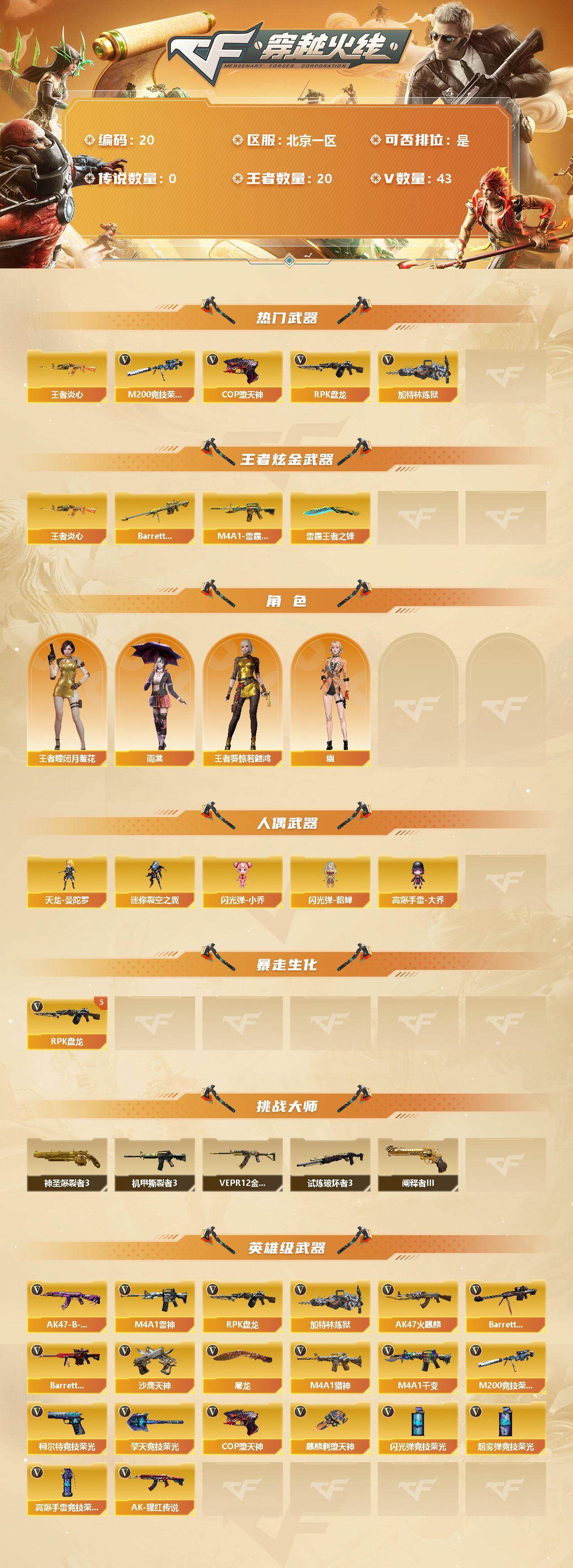 [12484603]【20】42V/50级/尉官/20王者/1英雄/M200-竞技荣光/王者炎心/RPK-盘龙/加特林-炼狱/COP-堕天神/Barrett-雷霆王者/M4A1-雷霆王者/雷霆王者之锋/王者-瞳-闭月羞花/王者葵-惊若翩鸿/幽/雨棠/天龙-曼陀罗/迷你裂空之翼/闪光弹-小乔/闪光弹-貂蝉/高爆手雷-大乔/5盘龙/神圣爆裂者/机甲撕裂者/阐释者/试炼破坏者/VEPR-12-金魔/柯尔特-竞技荣光/擎天-竞技荣光/高爆手雷-竞技荣光/烟雾弹-竞技荣光/闪光弹-竞技荣光/麒麟刺-堕天神/M4A1-雷神/AK47-火麒麟/Barrett-毁灭/Barrett-极光/M4A1-猎神/M4A1-千变/AK-47-猩红传说/AK47-B-常胜将军/沙鹰-天神/屠龙