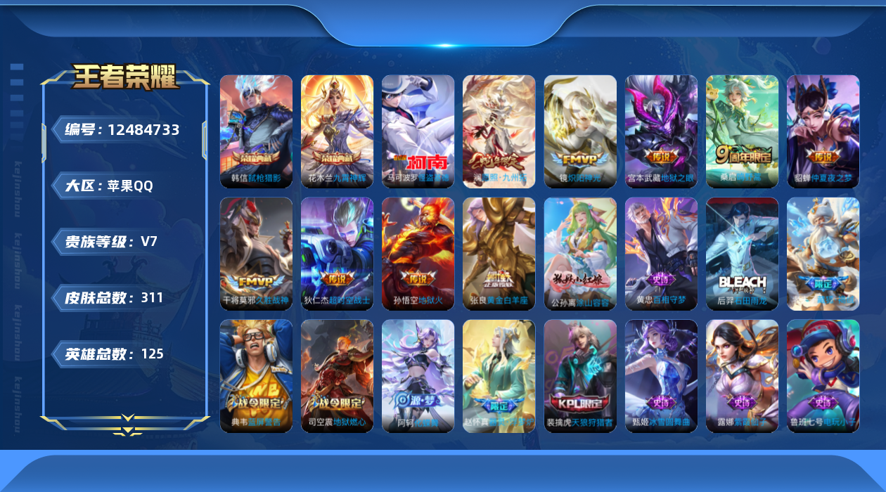 [12484733]【商品标题】:苹果Q-V7-最强王者段位-125英雄-311皮肤-2典藏-0珍品无双-0无双-1珍品传说-9传说-70史诗