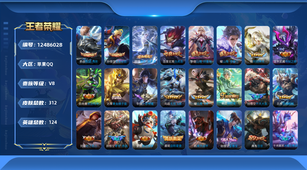 [12486028]【商品标题】:苹果Q-V7-至尊星耀V段位-124英雄-312皮肤-2典藏-0珍品无双-0无双-1珍品传说-18传说-94史诗