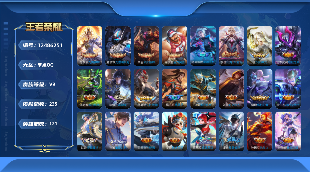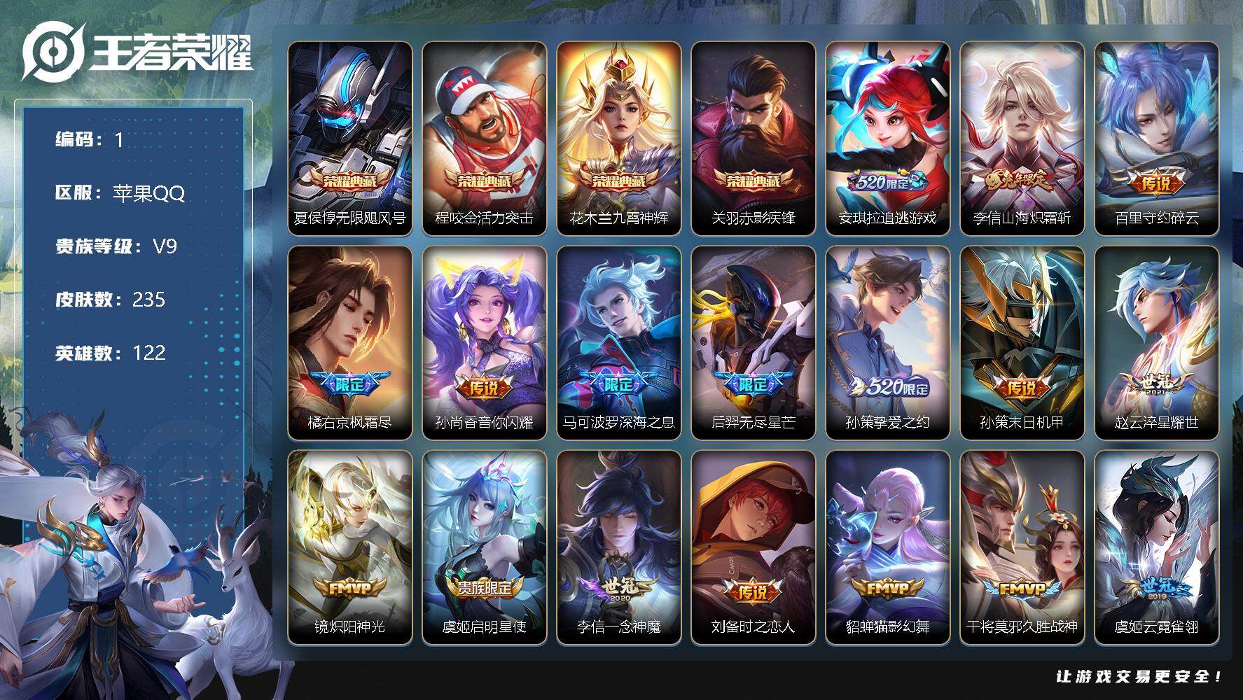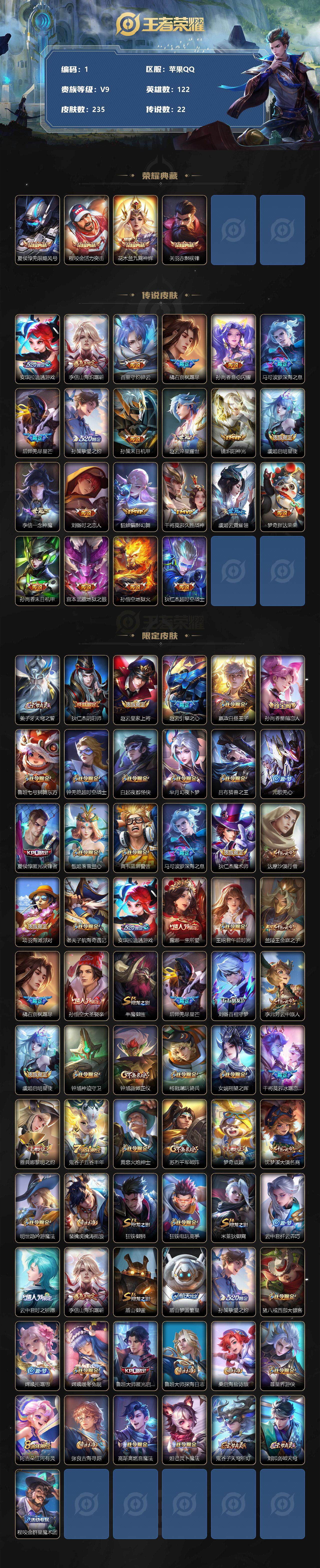 [12486251]【商品标题】:苹果Q-V9-荣耀黄金IV段位-122英雄-235皮肤-4典藏-0珍品无双-0无双-0珍品传说-22传说-62史诗