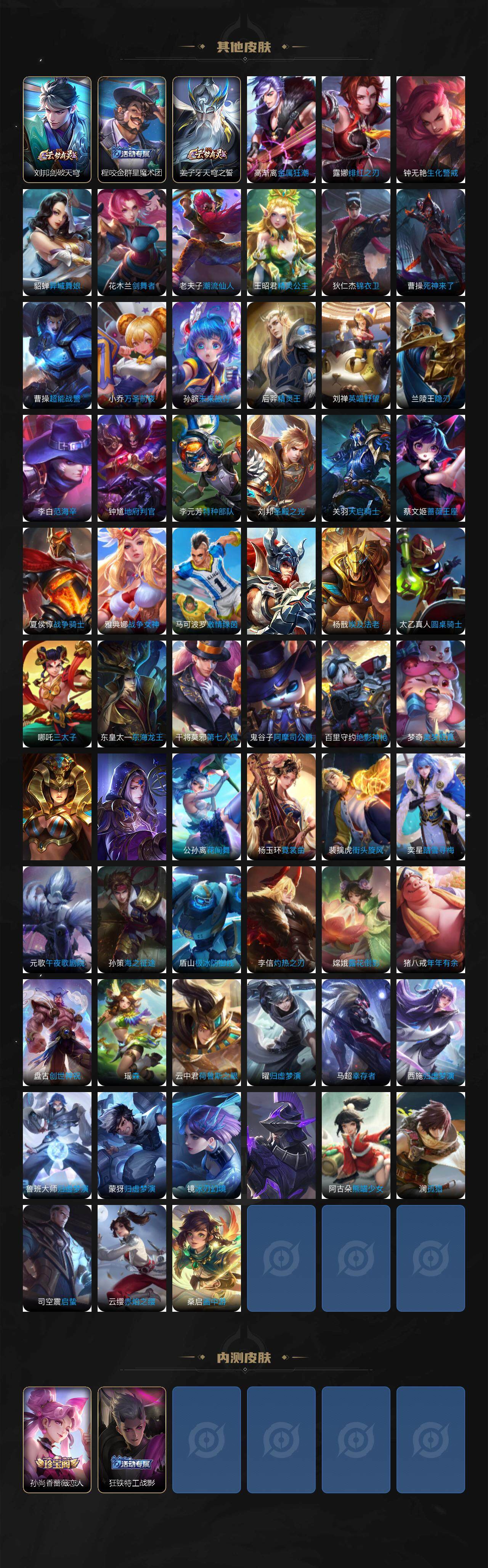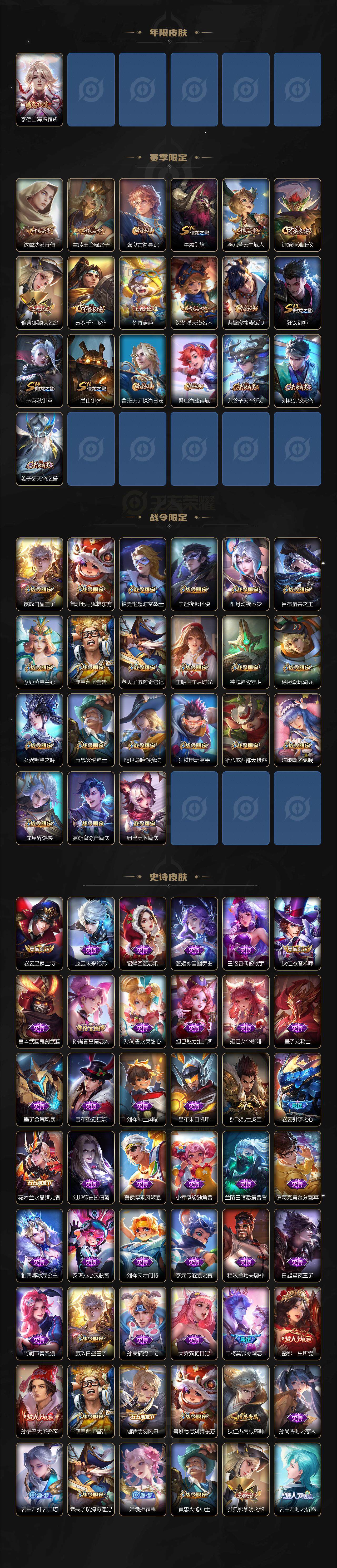 【限定皮肤】:姜子牙天穹之誓,狄仁杰阴阳师,赵云皇家上将,赵云引擎之心,嬴政白昼王子,孙尚香蔷薇恋人,鲁班七号狮舞东方,钟无艳超时空战士,白起夜都怪侠,芈月幻夜卜梦,吕布猎兽之王,元歌无心,夏侯惇匿光决锋者,甄姬落雪兰心,典韦蓝屏警告,马可波罗深海之息,狄仁杰魔术师,达摩沙漠行僧,项羽海滩派对,老夫子航海奇遇记,安琪拉追逃游戏,露娜一生所爱,王昭君午后时光,兰陵王金庭之子,橘右京枫霜尽,孙悟空大圣娶亲,牛魔御旌,后羿无尽星芒,刘备百相守梦,李元芳云中旅人,虞姬启明星使,钟馗神迹守卫,钟馗驱傩正仪,杨戬潮玩骑兵,女娲朔望之晖,干将莫邪冰霜恋舞曲,雅典娜黎明之约,鬼谷子五谷丰年,黄忠火炮绅士,苏烈千军破阵,梦奇顽趣,沈梦溪大漠名商,明世隐吟游魔法,裴擒虎擒涛扼浪,狂铁御狮,狂铁电玩高手,米莱狄御霄,云中君纤云弄巧,云中君时之祈愿,李信山海炽霜斩,盾山御銮,盾山梦圆繁星,孙策挚爱之约,猪八戒西部大镖客,嫦娥拒霜思,嫦娥暖冬兔眠,鲁班大师匿光启智者,鲁班大师探海日志,桑启海盐诗旅,暃星界游侠,阿古朵江河有灵,张良古海寻踪,高渐离燃音魔法,妲己灵卜魔法,鬼谷子天穹祈灯,刘邦剑破天穹,程咬金群星魔术团