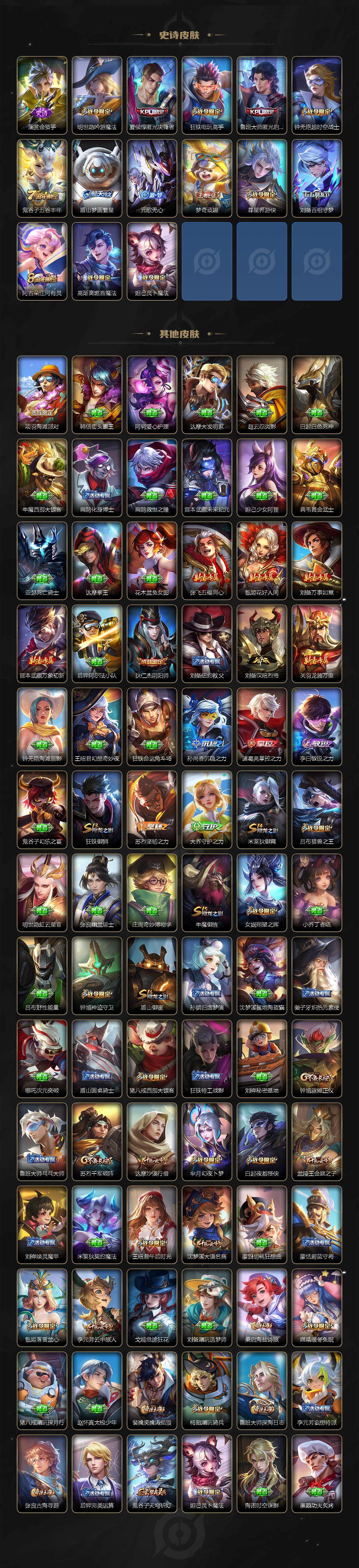 - [12090427]V9 1典藏 42传说 125英雄 325皮肤 可修改实名 优质装备:银白咏叹调(倪克斯侍卫),云鹰飞将(小将军),绛天战甲(鸡嘴战神),炽阳神光,一念神魔,云霓雀翎,地狱火,零号·赤焰,地狱之眼,飞鸢探春,李逍遥,时之恋人-刘备(电焊工),淬星耀世,末日机甲-孙策,挚爱之约,无双飞将,碎云,山海·炽霜斩(李信年限),山海·苍雷引(电光曜子),炽翼辉光(娃娃菜牛角包),燃星之曲,画中仙,浮生妄,记忆之芯(机甲兔),百相守梦(张飞),电玩·雷克斯,澜逐花归海 珍宝阁皮:优雅恋人,玩趣恶龙 限定皮:至尊宝,凤凰于飞,武陵仙君(小桃花),异界灵契(白毛香),傲雪梅枪,寅虎·展翼(孙膑年限),前尘镜,无限倾心-项羽,瑞麟志(木兰年限),诗剑行,无限倾心-虞姬,齐天大圣,匿光决锋者,怒海麟威,五谷丰年,青龙志(铠年限),梁祝,龙胆,天狼绘梦者,李小龙,玄武志(苏烈年限),朱雀志(守约年限),默契交锋-兰陵王,孙行者,猪悟能,匿光追影者,寅虎·御盾(廉颇年限),寅虎·瑞焰(虎皮蛋子),寅虎·心曲(虎婆),寅虎·赤拳(老虎年限),时之祈愿-云中君,百木心枪,启示之音,无尽星芒,深海之息(深海大菠萝),枫霜尽,山海·玄木吟(马可年限) 史诗皮:龙之律动,石田雨龙,怒海争锋,蔬乡物语(鲁班七号),百相守梦-黄忠,遇见神鹿,紫霞仙子,白龙吟,黄金分割率,千年之狐,永昼,江河有灵,匿光侦查者,真我赫兹(百里守约),魅语,百解令(蒙犽),高渐离燃音魔法,蒙恬荣光圣徽,无限星赏官,匿光破解者,偶像歌手,电玩·爆裂旋风,百相守梦(刘备),暗夜猫娘,百相守梦(关羽),末日机甲-吕布,猫狗日记-孙策,时之恋人-孙尚香,女仆咖啡,水果甜心,天才门将,星夜王子,心灵骇客,功夫厨神,德古拉伯爵,暗隐猎兽者,幽灵船长,鬼剑武藏,心灵战警,乐园奇幻夜,舞动绿茵,纤云弄巧,繁星吟游(呼啦呼啦),拒霜思,缤纷独角兽,乘风破浪,逐浪之夏,龙鼓争鸣,月团寄思,水晶猎龙者,热力回旋,箭羽风息,唤灵魅影,金属风暴,圣诞恋歌,鹰眼统帅,魅力维加斯,赏金猎手,奇遇舞章,天秀·音浪,寅虎·御盾,无心,未来纪元-赵云