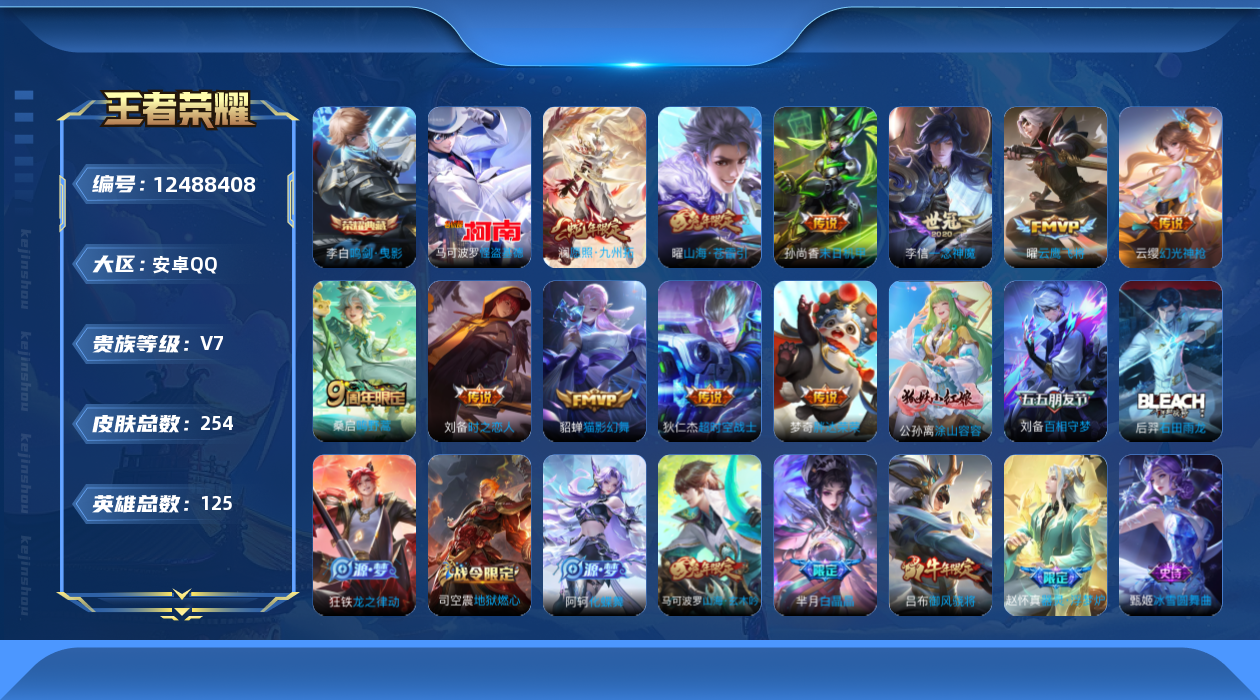 [12488408]【商品标题】:安卓Q-V7-至尊星耀II段位-126英雄-254皮肤-1典藏-0珍品无双-0无双-1珍品传说-11传说-67史诗