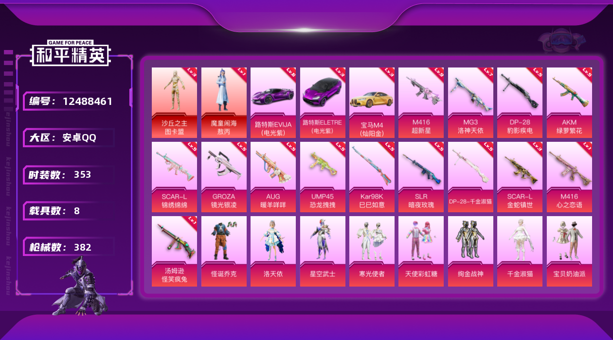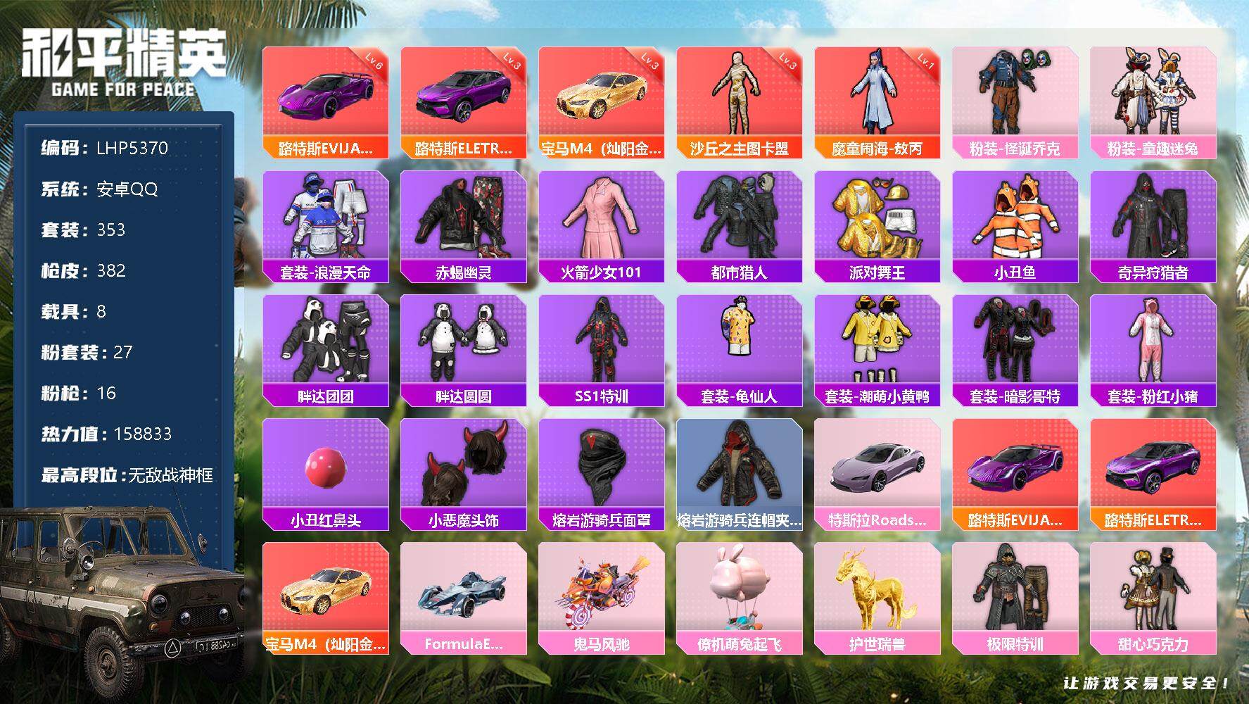 [12488461]素材身法号/路特斯EVIJA(电光紫)(六级)/老101/无敌战神框4/绝世印记1/M416-超新星(九级)【特价急出/详情看图】:安卓 手Q-无敌战神框-2神装-27粉装-16特效枪-8载具-8粉色飞行器-15.8w热力值-34王牌印记-353套装-382枪皮【红色载具】:路特斯ELETRE(电光紫)(三级),路特斯EVIJA(电光紫)(六级),宝马M4(灿阳金)(三级)【红色神装等级】:魔童闹海-敖丙(一级),沙丘之主-图卡盟(三级)【热门品类】:粉装-怪诞乔克,粉装-童趣迷兔,套装-浪漫天命,套装-赤蝎幽灵,套装-火箭少女101,套装-都市猎人,套装-派对舞王,套装-小丑鱼,套装-奇异狩猎者,套装-胖达团团,套装-胖达圆圆,套装-SS1特训,套装-龟仙人,套装-潮萌小黄鸭,套装-暗影哥特,套装-粉红小猪,小丑红鼻头,小恶魔头饰,熔岩游骑兵面罩,熔岩游骑兵连帽夹克【粉色载具】:特斯拉Roadster(沁心粉),路特斯EVIJA(电光紫),路特斯ELETRE(电光紫),宝马M4(灿阳金),Formula E Gen2(巅峰兰),鬼马风驰,僚机-萌兔起飞,护世瑞兽【粉色套装】:粉装-极限特训,粉装-怪诞乔克,粉装-甜心巧克力,粉装-宝贝奶油派,粉装-天使彩虹糖,粉装-金风玉露,粉装-智能音符,粉装-放客神游,粉装-向日葵,粉装-极致幻想,粉装-草莓生巧,粉装-绚金战神,粉装-冰霜白皇,粉装-童趣迷兔,粉装-彩虹鹿灵,角色-洛天依,角色-2号机款机体服,粉装-蓝莓炮弹,粉装-焦糖拿铁,粉装-岚岚物语,粉装-橘柚倾心,粉装-暖熊萌萌,粉装-寒光使者,角色-水仙星,角色-圣堂之誓,角色-星空武士,角色-千金淑猫【粉色枪皮等级】:AKM-绿萝繁花(五级),SCAR-L-锦绣绵绵(五级),SCAR-L-金蛇镇世(三级),M416-心之恋语(一级),M416-超新星(九级),GROZA-镜光银凌(五级),AUG-暖羊咩咩(五级),UMP45-恐龙拽拽(五级),汤姆逊-怪笑疯兔(一级),Kar98K-巳巳如意(五级),SLR-暗夜玫瑰(五级),DP-28-千金淑猫(五级),DP-28-豹影疾电(五级),MG3-洛神天依(七级)【粉色飞行器】:神秘黑猫飞行器,夏日绵绵冰飞行器,焦糖拿铁飞行器,万象金身飞行器,圣域金龙飞行器,终晖之翼飞行器,飞天猪飞行器