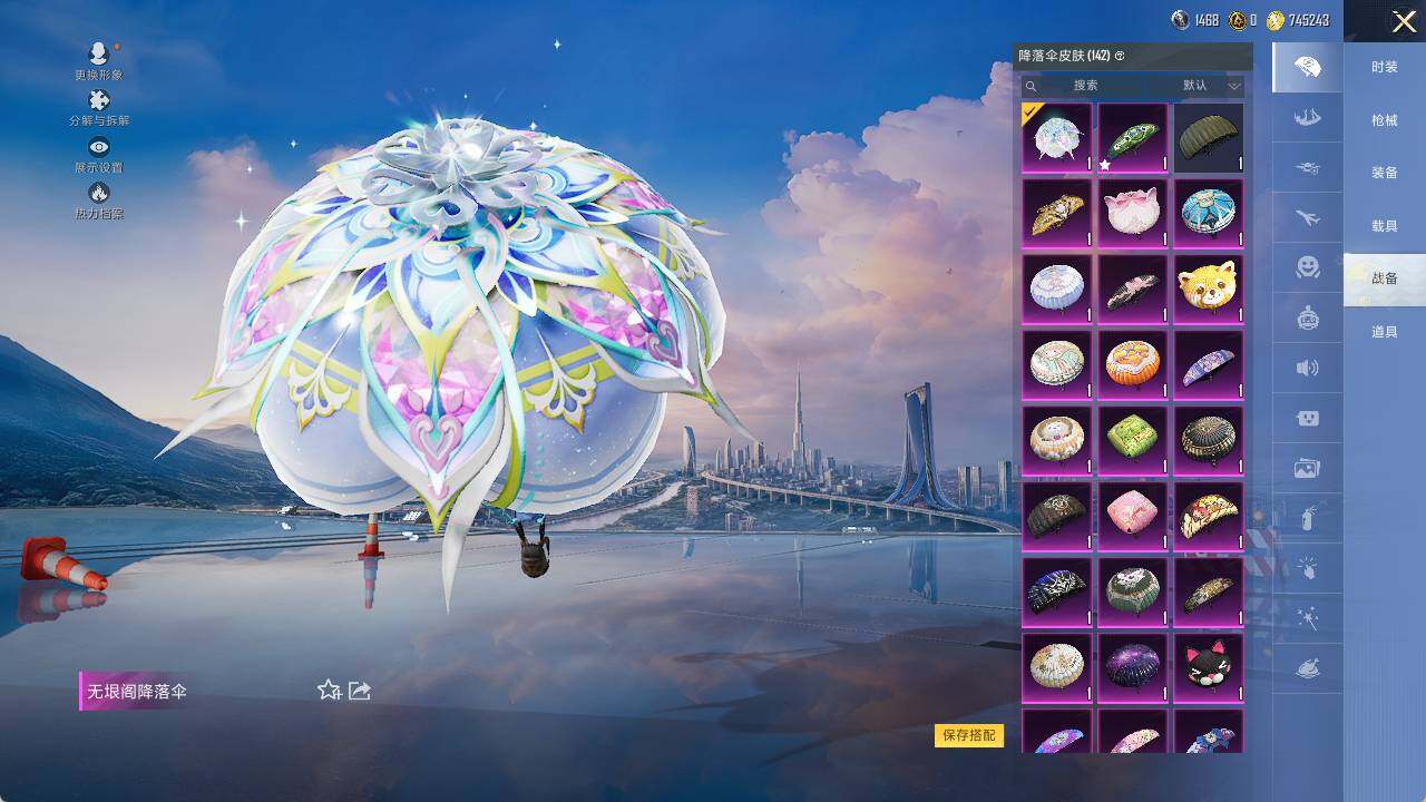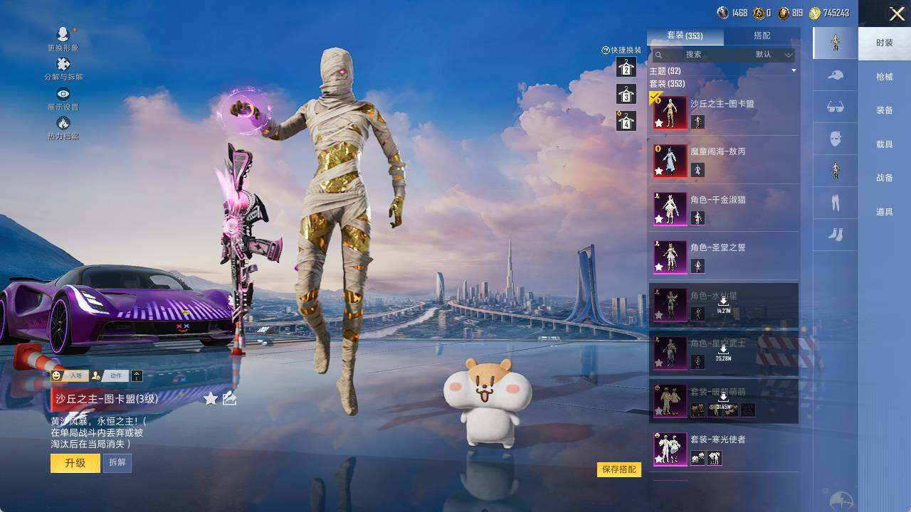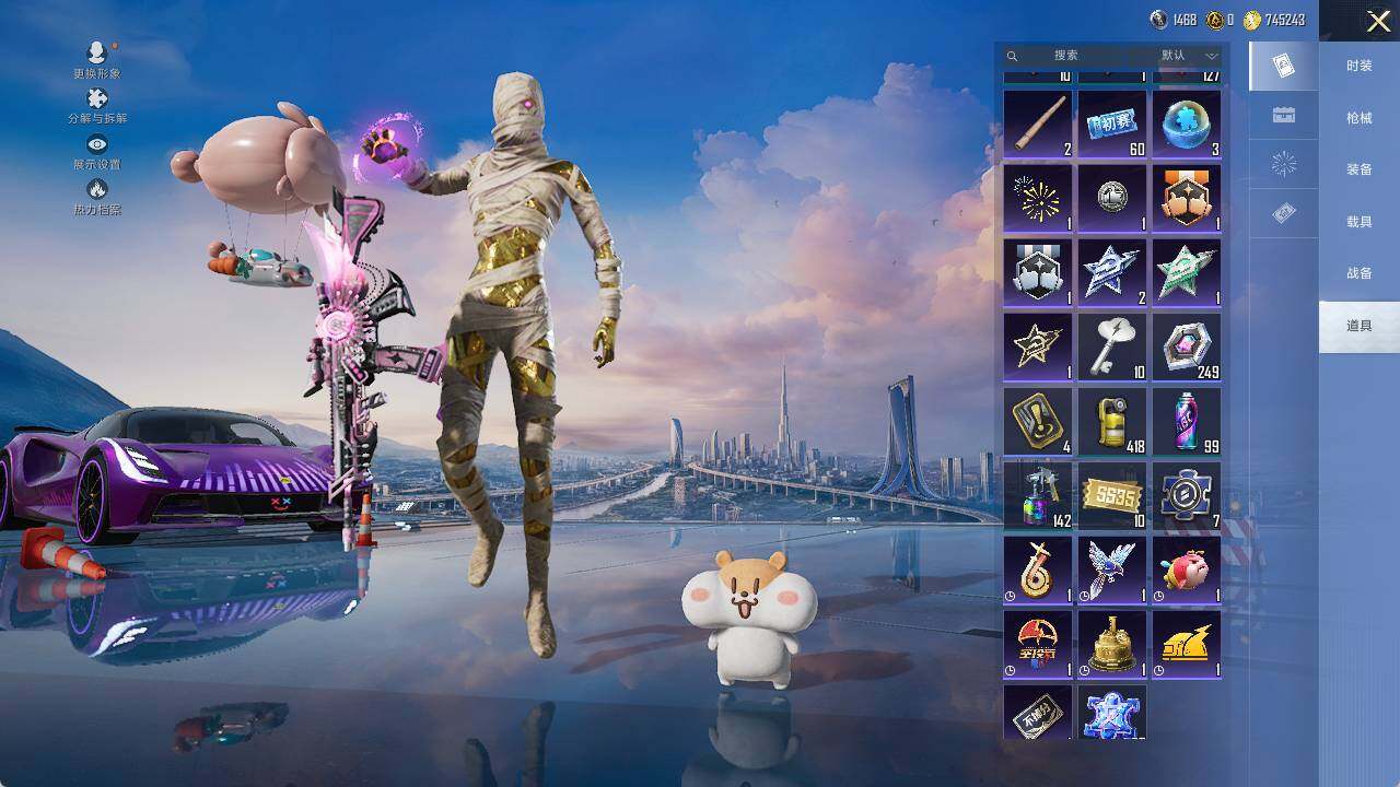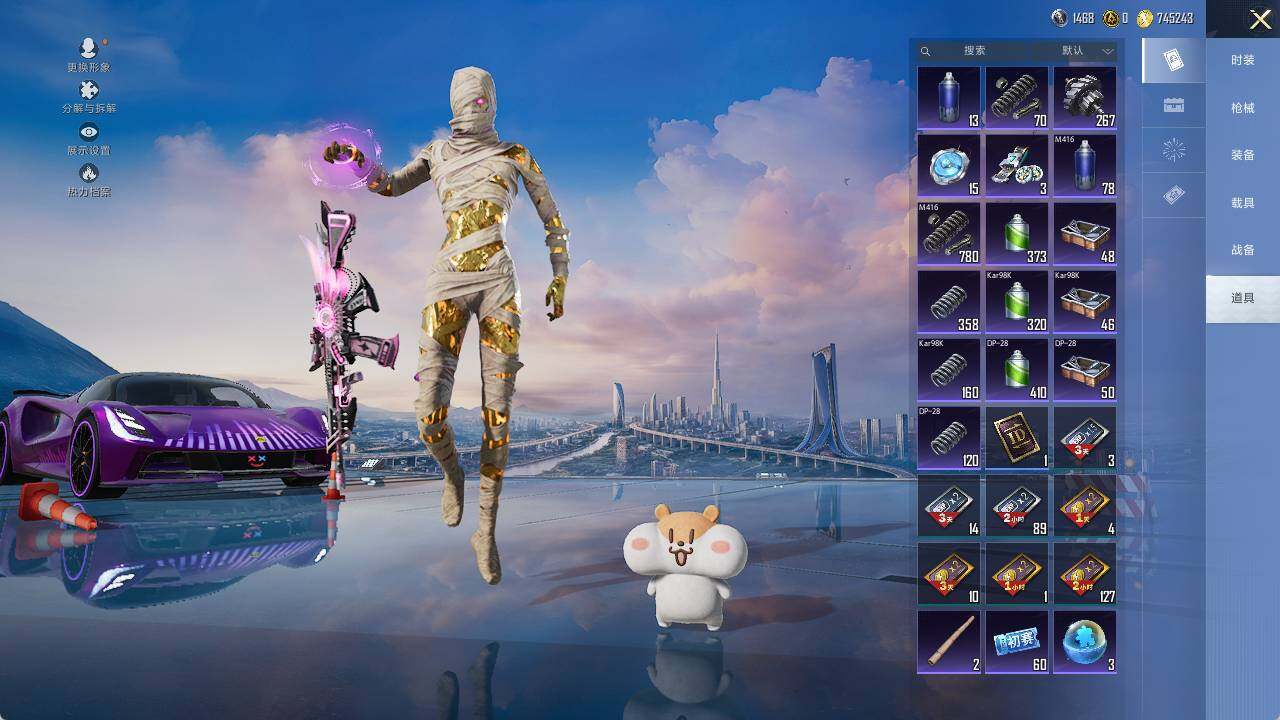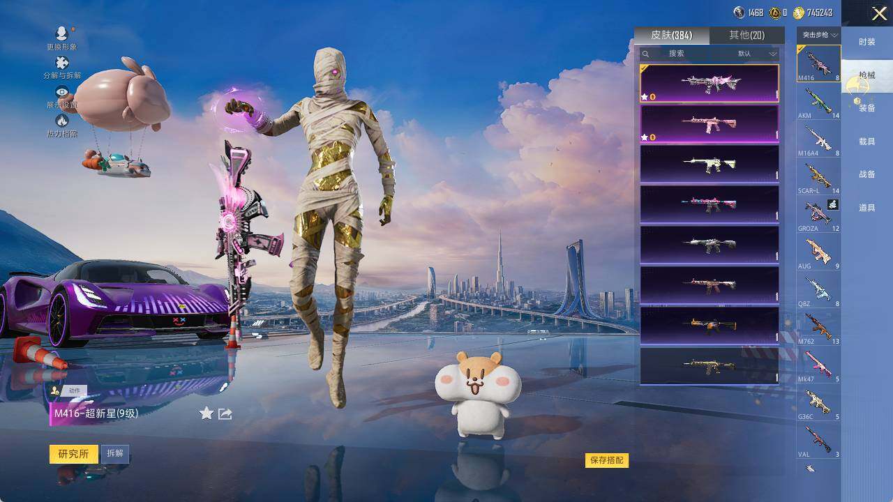 AKM-绿萝繁花,SCAR-L-金蛇镇世,M416-心之恋语,M416-超新星,GROZA-镜光银凌,AUG-暖羊咩咩,UMP45-恐龙拽拽,汤姆逊-怪笑疯兔,Kar98K-巳巳如意,SLR-暗夜玫瑰,DP-28-千金淑猫,MG3-洛神天依,烟雾弹-猫咪绅士,破片手榴弹-粉粉猫爪