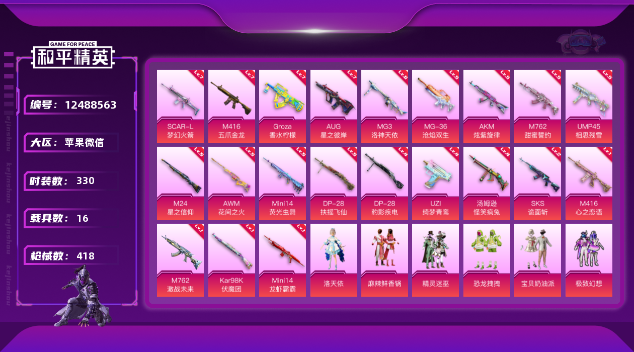 [12488563]素材身法号【特价急出/详情看图】:苹果 微信-30粉装-22特效枪-16载具-18粉色飞行器-19.7w热力值-30王牌印记-330套装-418枪皮【热门品类】:粉装-雪国幻梦,粉装-梦幻火箭,粉装-缤纷油彩,套装-S1赛事,套装-浪漫天命,套装-奇异狩猎者,套装-金羽特工,套装-浪客战士,套装-SS1特训,套装-龟仙人,套装-潮萌小黄鸭,套装-暗影哥特,套装-浪漫波比,套装-粉红小猪,套装-萌熊伴侣,小恶魔头饰,熔岩游骑兵连帽夹克【粉色载具】:特斯拉Model 3(珍珠白),特斯拉Model X(珍珠白),特斯拉Roadster(水滴蓝),兰博基尼Aventador SVJ(翡翠绿),阿斯顿马丁DBS(绿),阿斯顿马丁DBX(橙),玛莎拉蒂Ghibli(蓝),合金龙骨(蓝),灵鼠银迹,焰龙咆哮,萌喵橘座,双人摩托-梦幻火箭,双人摩托-双刃魅影(红),鬼马风驰,空客H135-蔚蓝之翼,快艇-塞莎KL27(深潜蓝)【粉色套装】:粉装-守护骑士,粉装-宝贝奶油派,粉装-天使彩虹糖,粉装-金曜白虎,粉装-雪国幻梦,粉装-蝶舞迷情,粉装-精灵迷巫,粉装-梦幻火箭,粉装-金风玉露,粉装-麻辣鲜香锅,粉装-金属狂野,粉装-缤纷油彩,粉装-向日葵,粉装-极致幻想,粉装-潮汐统领,粉装-诡面斩,粉装-锦绣火鲤,粉装-迷蝶贵族,粉装-俏皮狐尾,粉装-草莓生巧,粉装-香水柠檬,粉装-暗翼战神,粉装-星之彼岸,粉装-相思残雪,粉装-葫芦兄弟,角色-洛天依,粉装-海渊国主,粉装-流星咚咚,粉装-恐龙拽拽,角色-异瞳寒姬【粉色枪皮等级】:AKM-炫紫旋律(五级),SCAR-L-梦幻火箭(七级),M416-五爪金龙(七级),M416-心之恋语(一级),GROZA-香水柠檬(七级),AUG-星之彼岸(七级),M762-甜蜜誓约(五级),M762-激战未来(一级),UZI-绮梦青鸾(四级),UMP45-相思残雪(五级),汤姆逊-怪笑疯兔(四级),Kar98K-伏魔团(一级),M24-星之信仰(五级),AWM-花间之火(五级),SKS-诡面斩(二级),Mini14-龙虾霸霸(一级),Mini14-荧光虫舞(五级),DP-28-扶摇飞仙(五级),DP-28-豹影疾电(四级),MG3-洛神天依(六级),MG-36-沧焰双生(五级)【粉色飞行器】:春暖花开飞行器,精灵迷巫飞行器,梦幻火箭飞行器,花间之火