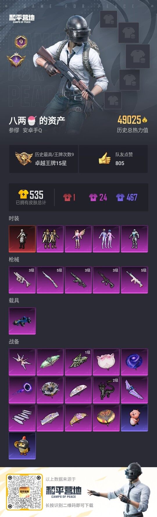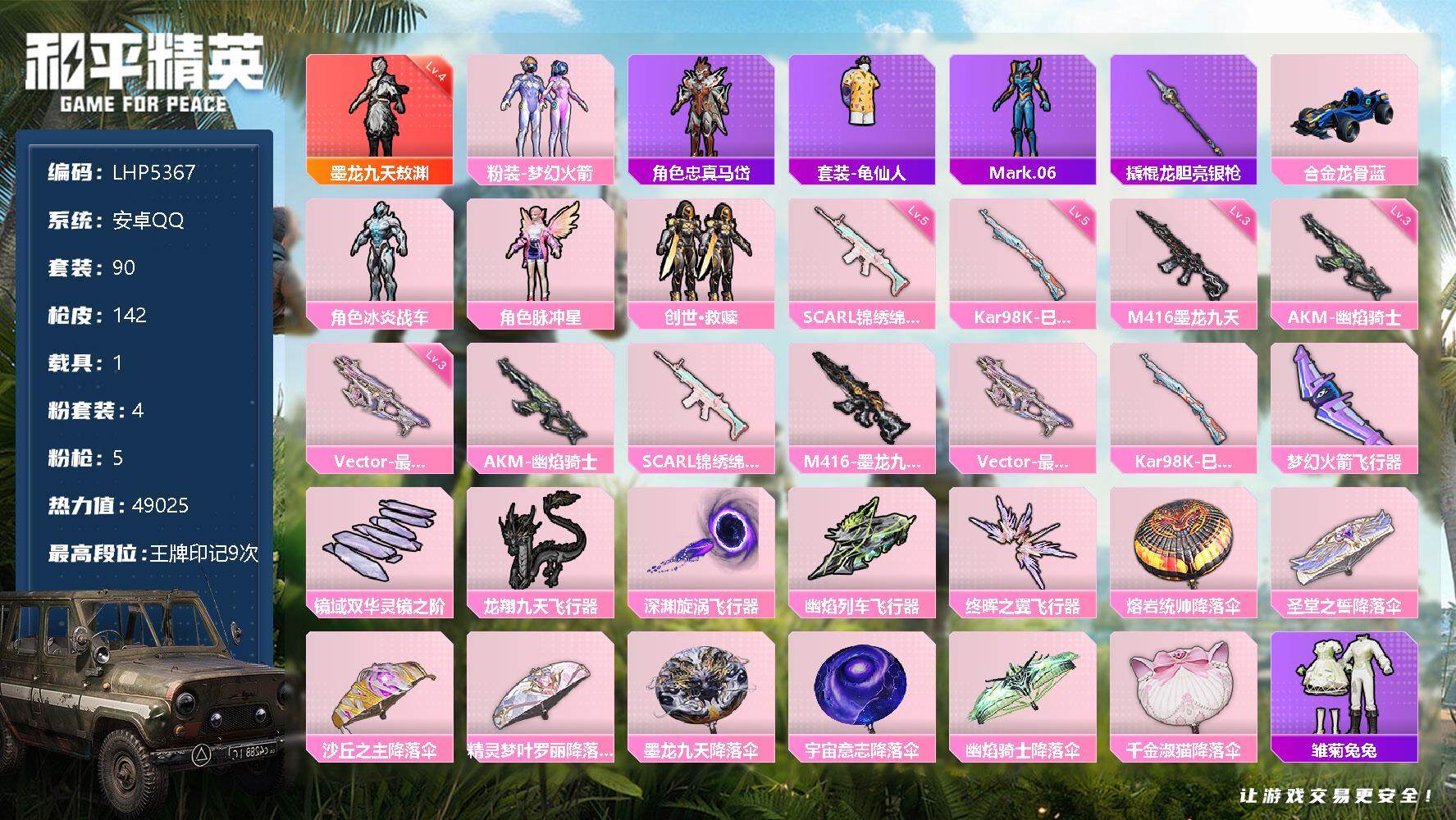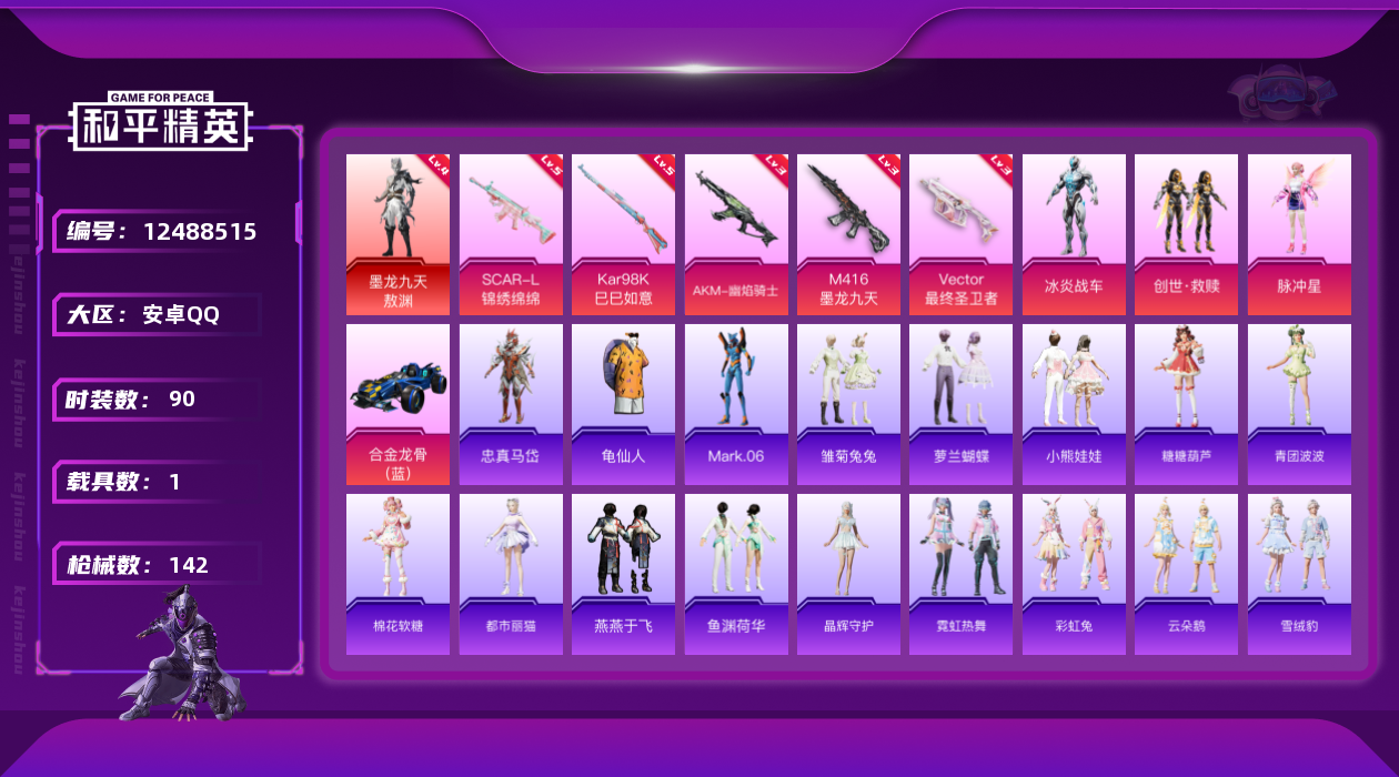 - PX_2081835- 苹果手Q-14王牌印记-有战神框-8粉装-14特效枪-9载具-115166热力值-213套装-266枪皮-7卓越印记-3传奇印记 【8粉装】,梦幻火箭,初号机款机体服,星穹咏叹调,千金淑猫,流星咚咚,蜜语绒猫,天禅智恒,仲夏莫吉托 【14特效枪】AKM-幽焰骑士-3级 AKM-梦之光华-4级 SCAR-L-青春物语-5级 M416-五爪金龙-1级 M416-墨龙九天-6级