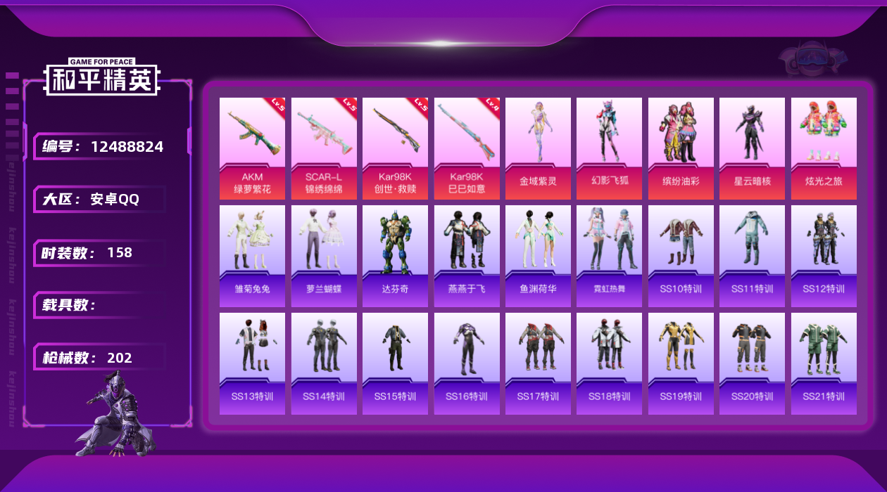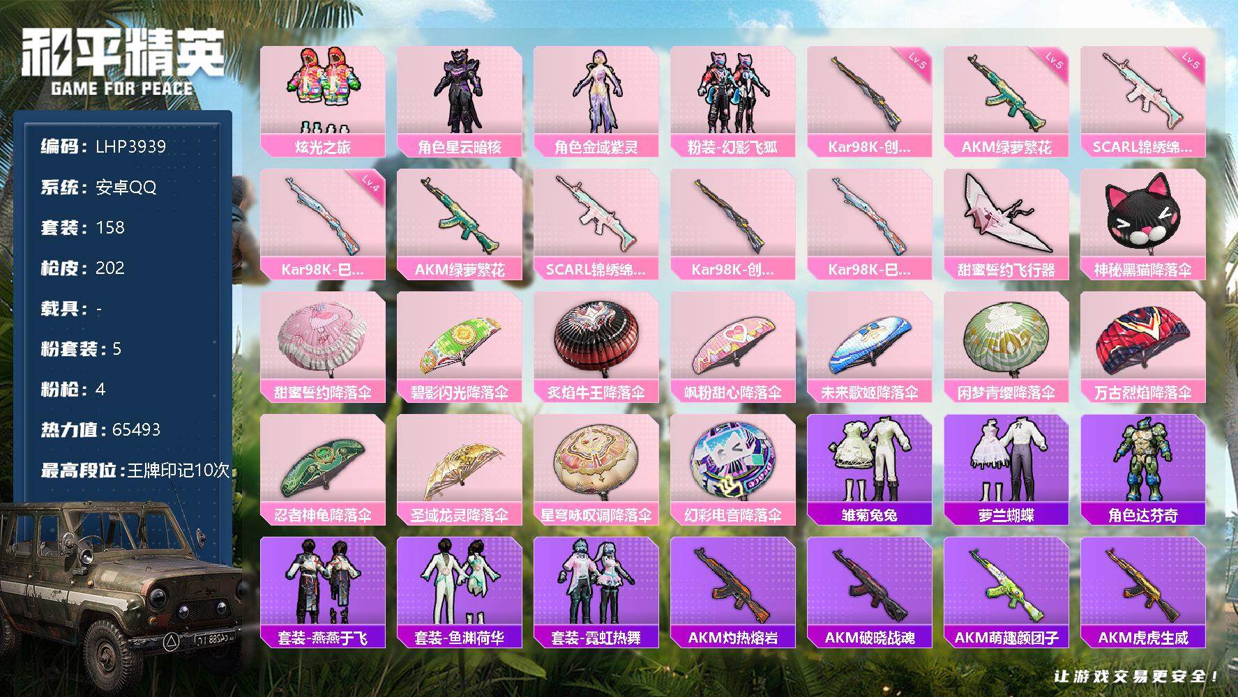 [12488824]【暑期末清货/特价急出/永久包赔/商品详情看图】:安卓 手Q-5粉装-4特效枪-6.5w热力值-10印记-158套装-202枪皮【特效枪等级】:AKM-绿萝繁花(五级),SCAR-L-锦绣绵绵(五级),Kar98K-创世·救赎(五级),Kar98K-巳巳如意(四级)【优质套装】:粉装-缤纷油彩,粉装-炫光之旅,角色-星云暗核,角色-金域紫灵,粉装-幻影飞狐【优质飞行器】:甜蜜誓约飞行器