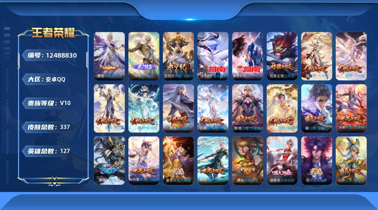 - [12152103]【商品标题】:安卓WX-V5-最强王者段位-123英雄-249皮肤-1典藏-0珍品无双-0无双-0珍品传说-6传说-56史诗 【荣耀典藏】:孙悟空全息碎影 【传说皮肤】:云缨幻光神枪,桑启鸣野蒿,鲁班七号寅虎瑞焰,李信一念神魔,达摩黄金狮子座,孙悟空地狱火 【限定皮肤】:白起狰,姜子牙天穹之誓,狄仁杰阴阳师,虞姬凯尔特女王,赵云皇家上将,嬴政白昼王子,鲁班七号狮舞东方,鲁班七号寅虎瑞焰,庄周高山流水,高渐离玩趣恶龙,孙膑妖精王,扁鹊炼金王,白起夜都怪侠,芈月重明,吕布猎兽之王,周瑜赤莲之焰,元歌云间偶戏,夏侯惇朔风刀,曹操烛龙,典韦穷奇,狄仁杰魔术师,狄仁杰万华元夜,达摩星际陆战队,达摩沙漠行僧,项羽海滩派对,老夫子醍醐杖,程咬金演武夺筹,兰陵王驯魔猎人,兰陵王金庭之子,亚瑟潮玩骑士王,牛魔御旌,后羿圣弓游侠,李元芳银河之约,李元芳云中旅人,钟馗神迹守卫,钟馗驱傩正仪,杨玉环遇见飞天,干将莫邪胡桃夹子,干将莫邪真爱魔法,雅典娜黎明之约,蔡文姬繁星吟游,太乙真人饕餮,鬼谷子原初探秘者,鬼谷子五谷丰年,苏烈千军破阵,百里玄策原初追逐者,弈星混沌棋,梦奇顽趣,沈梦溪星空之诺,沈梦溪大漠名商,明世隐疑决卦,明世隐吟游魔法,裴擒虎李小龙,裴擒虎擒涛扼浪,狂铁御狮,米莱狄御霄,米莱狄胡桃异想国,盾山御銮,猪八戒猪悟能,鲁班大师探海日志,桑启海盐诗旅,阿古朵江河有灵,张良古海寻踪,蒙恬荣光圣徽,鬼谷子天穹祈灯,沈梦溪龙舞盛年,刘邦剑破天穹,程咬金群星魔术团,周瑜熔金海岸 【年限皮肤】:鲁班七号寅虎瑞焰 【赛季限定】:孙膑妖精王,扁鹊炼金王,白起狰,芈月重明,夏侯惇朔风刀,曹操烛龙,典韦穷奇,狄仁杰万华元夜,达摩沙漠行僧,老夫子醍醐杖,程咬金演武夺筹,兰陵王金庭之子,张良古海寻踪,牛魔御旌,李元芳云中旅人,虞姬凯尔特女王,钟馗驱傩正仪,雅典娜黎明之约,太乙真人饕餮,鬼谷子原初探秘者,苏烈千军破阵,百里玄策原初追逐者,弈星混沌棋,梦奇顽趣,沈梦溪大漠名商,明世隐疑决卦,裴擒虎擒涛扼浪,狂铁御狮,米莱狄御霄,盾山御銮,鲁班大师探海日志,桑启海盐诗旅,鬼谷子天穹祈灯,蒙恬荣光圣徽,刘邦剑破天穹,姜子牙天穹之誓 【战令限定】:嬴政白昼王子,鲁班七号狮舞东方,白起夜都怪侠,吕布猎兽之王,周瑜赤莲之焰,元歌云间偶戏,达摩星际陆战队,兰陵王驯魔猎人,亚瑟潮玩骑士王,后羿圣弓游侠,李元芳银河之约