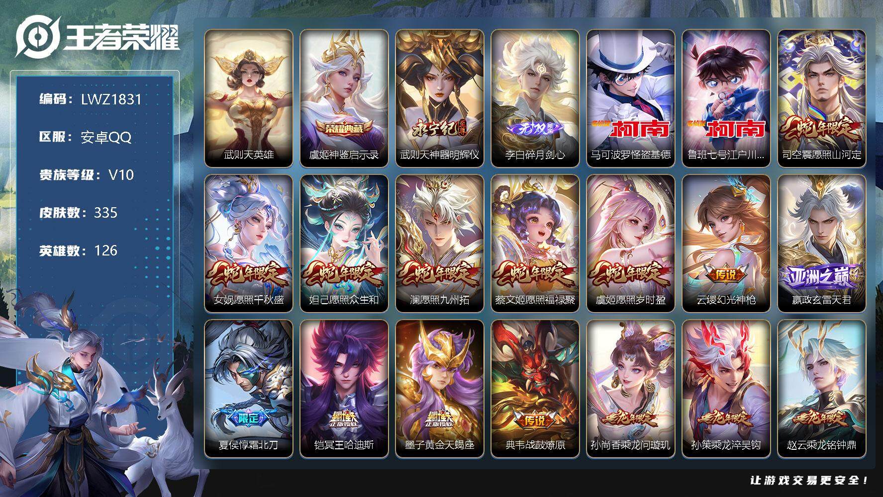 [12488830]暑期末清货/特价急出/永久包赔【商品标题】:安卓Q-V10-最强王者段位-126英雄-335皮肤-1典藏-0珍品无双-2无双-2珍品传说-30传说-74史诗 【荣耀典藏】:武则天英雄,虞姬神鉴启示录 【无双皮肤】:武则天神器明辉仪,李白碎月剑心 【珍品传说】:马可波罗怪盗基德,鲁班七号江户川柯南 【内测皮肤】:孙尚香蔷薇恋人,狂铁特工战影 【传说皮肤】:武则天海洋之心,李白凤求凰,貂蝉仲夏夜之梦,诸葛亮武陵仙君,后羿黄金射手座,百里玄策白虎志,干将莫邪久胜战神,刘备时之恋人,虞姬启明星使,周瑜音你心动,李信山海炽霜斩,曜山海苍雷引,小乔山海琳琅生,孙悟空齐天大圣,艾琳觅芳踪,赵云乘龙铭钟鼎,孙策乘龙淬吴钩,孙尚香乘龙问璇玑,典韦战鼓燎原,墨子黄金天蝎座,铠冥王哈迪斯,夏侯惇霜北刀,嬴政玄雷天君,云缨幻光神枪,虞姬愿照岁时盈,蔡文姬愿照福禄聚,澜愿照九州拓,妲己愿照众生和,女娲愿照千秋盛,司空震愿照山河定 【限定皮肤】:白起狰,夏侯惇霜北刀,铠冥王哈迪斯,暃埋骨钱,大乔绒语心约,姜子牙天穹之誓,狄仁杰阴阳师,小乔纯白花嫁,虞姬凯尔特女王,小乔山海琳琅生,赵云皇家上将,墨子神迹守卫,嬴政白昼王子,孙尚香蔷薇恋人,鲁班七号狮舞东方,庄周蜃楼王,孙膑妖精王,扁鹊炼金王,芈月重明,周瑜真爱至上,夏侯惇朔风刀,甄姬游园惊梦,曹操烛龙,典韦穷奇,马可波罗山海玄木吟,狄仁杰魔术师,狄仁杰万华元夜,达摩星际陆战队,达摩沙漠行僧,项羽海滩派对,项羽霸王别姬,老夫子醍醐杖,老夫子航海奇遇记,关羽冰锋战神,程咬金演武夺筹,兰陵王金庭之子,亚瑟狮心王,孙悟空至尊宝,孙悟空齐天大圣,牛魔御旌,李元芳银河之约,李元芳云中旅人,虞姬霸王别姬,虞姬启明星使,钟馗神迹守卫,钟馗驱傩正仪,杨玉环遇见飞天,雅典娜黎明之约,太乙真人饕餮,鬼谷子原初探秘者,诸葛亮武陵仙君,大乔白鹤梁神女,苏烈千军破阵,百里玄策白虎志,弈星混沌棋,沈梦溪星空之诺,沈梦溪大漠名商,明世隐疑决卦,裴擒虎李小龙,裴擒虎擒涛扼浪,狂铁御狮,米莱狄御霄,米莱狄胡桃异想国,瑶山海碧波行,云中君纤云弄巧,李信山海炽霜斩,伽罗天狼溯光者,盾山御銮,上官婉儿梁祝,嫦娥拒霜思,曜山海苍雷引,西施玲珑珍味,鲁班大师探海日志,桑启海盐诗旅,暃星界游侠,艾琳流音漫舞,司空震地狱燃心,张良古海寻踪,蒙犽百解令,艾琳觅芳踪,高渐离燃音魔法,妲己灵卜魔法,