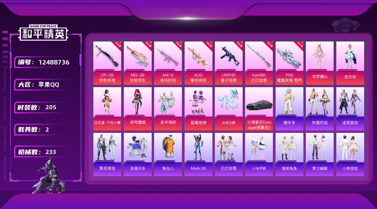 [12488736]素材身法号【特价急出/详情看图】:苹果 手Q-6粉装-7特效枪-2载具-1粉色飞行器-7.4w热力值-18王牌印记-205套装-233枪皮【热门品类】:套装-浪漫天命,套装-龟仙人,角色-Mark.06【粉色载具】:兰博基尼Estoque(银翼灰),冰绡玉鳞【粉色套装】:角色-洛天依,粉装-蓝莓炮弹,粉装-金丰海韵,角色-狂花道·不知火舞,角色-绯穹魔姬,角色-羊梦糖心【粉色枪皮等级】:M416-电玩时刻(五级),AUG-暖羊咩咩(五级),UMP45-量子极限(五级),P90-魔童闹海 敖丙(三级),Kar98K-巳巳如意(五级),DP-28-豹影疾电(五级),MG-36-沧焰双生(五级)【粉色飞行器】:灵珠游龙飞行器