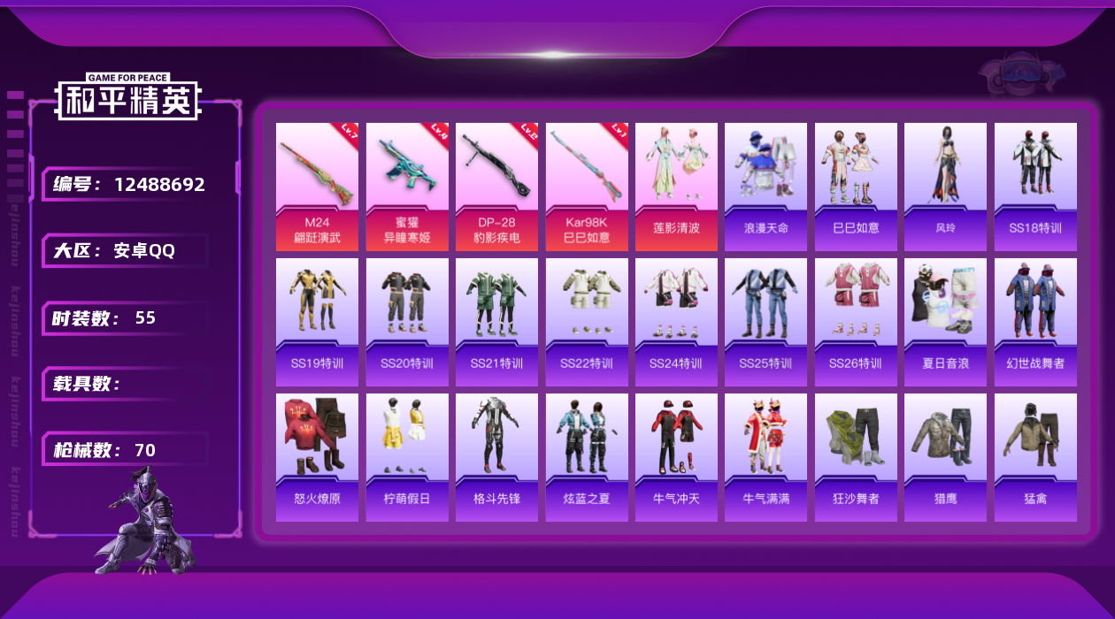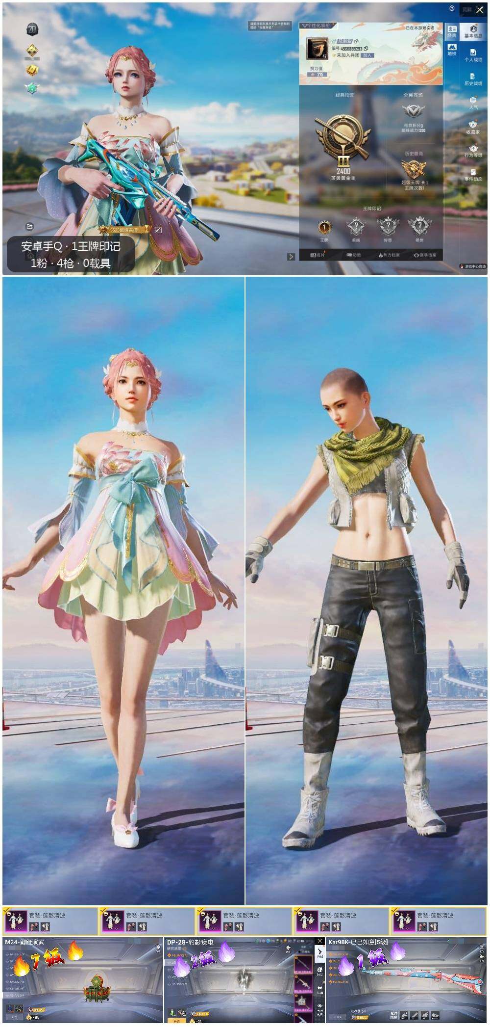 [12488692]【特价急出/详情看图】:安卓 手Q-1粉装-4特效枪-1粉色飞行器-2.3w热力值-1王牌印记-55套装-70枪皮【热门品类】:套装-浪漫天命【粉色套装】:粉装-莲影清波【粉色枪皮等级】:蜜獾-异瞳寒姬(四级),Kar98K-巳巳如意(一级),M24-翩跹演武(七级),DP-28-豹影疾电(二级)【粉色飞行器】:千面幻镜飞行器