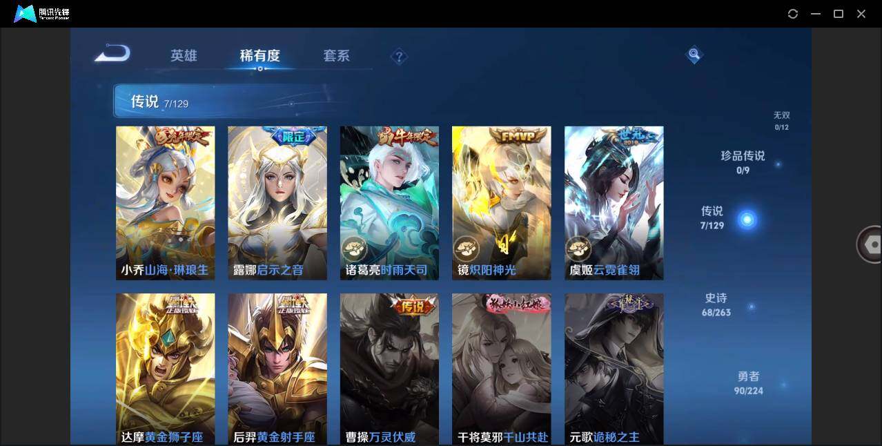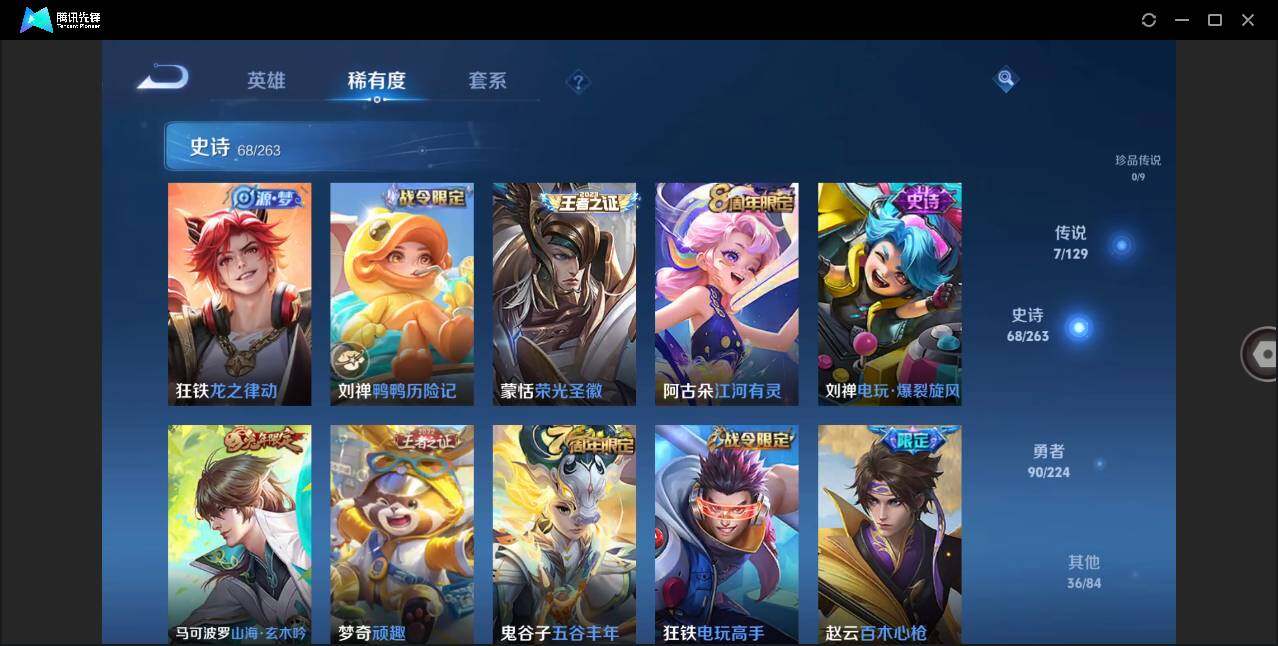 - [11526258]V8 1典藏 1珍品传说 16传说 125英雄 345皮肤 可修改实名 优质装备:鸣剑·曳影,怪盗基德,云鹰飞将(小将军),久胜战神,炽阳神光,末日机甲-孙尚香(绿蚂蚱),仲夏夜之梦(大飞蛾),零号·赤焰,地狱之眼,妄想实况,澜逐花归海 传说皮:幻光神枪 珍宝阁皮:胡桃夹子,万物之道,优雅恋人 限定皮:愿照·千秋盛(女娲年限),逐霄战戟,鸣野蒿,夏侯惇霜北刀,至尊宝,凤凰于飞,时雨天司(水龙头),飞衡(韩信年限),遇见飞天,高山流水,诗剑行,五谷丰年,梁祝,李小龙,默契交锋-花木兰,美猴王,山海·玄木吟(马可年限) 史诗皮:器灵·浮梦炉,化蝶舞,星界战将,谪仙醉月,龙之律动,雪豹·霜爪,茶境仙,怒海争锋,炽弈燎原,破空之剑,上官婉儿群星魔术团,百相守梦-百里守约,星界特工,百相守梦-黄忠,苍穹之光,白龙吟,特工魅影,千年之狐,江河有灵,百解令(蒙犽),高渐离燃音魔法,蒙恬荣光圣徽,无限星赏官,冰冠公主,青蛇,电玩·爆裂旋风,末日机甲-吕布,猫狗日记-孙策,猫狗日记-大乔,乱世虎臣,节奏热浪,修罗,摇滚巨星,水果甜心,绅士熊喵,天才门将,星夜王子,心灵骇客,功夫厨神,德古拉伯爵,暗隐猎兽者,幽灵船长,鬼剑武藏,暗渊魔法,心灵战警,天秀·启明,地狱岩魂,纤云弄巧,繁星吟游(呼啦呼啦),拒霜思,缤纷独角兽,乘风破浪,逐浪之夏,水晶猎龙者,曙光守护者,金属风暴,原初追逐者,圣诞狂欢,圣诞恋歌,鹰眼统帅,王者之锤,暗夜贵公子,黎明之约,无心,未来纪元-赵云