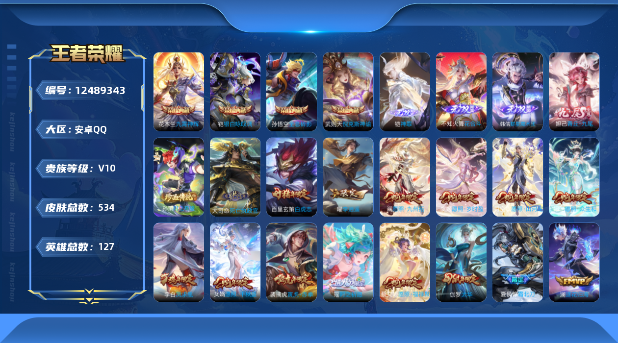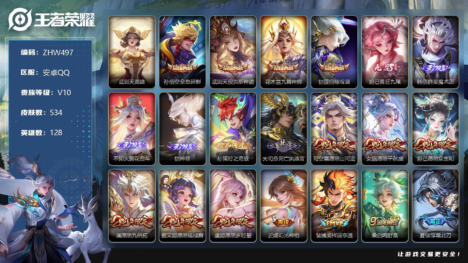 [12489343]【商品标题】:安卓Q-V10-最强王者段位-128英雄-534皮肤-4典藏-0珍品无双-4无双-1珍品传说-69传说-185史诗