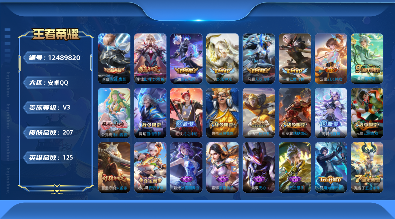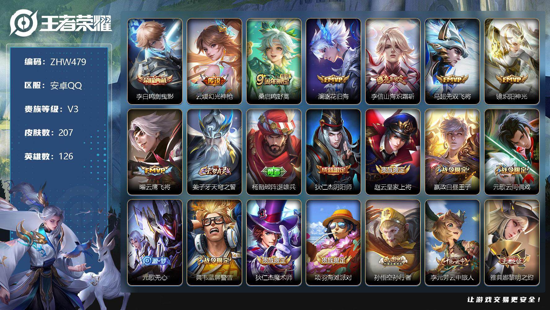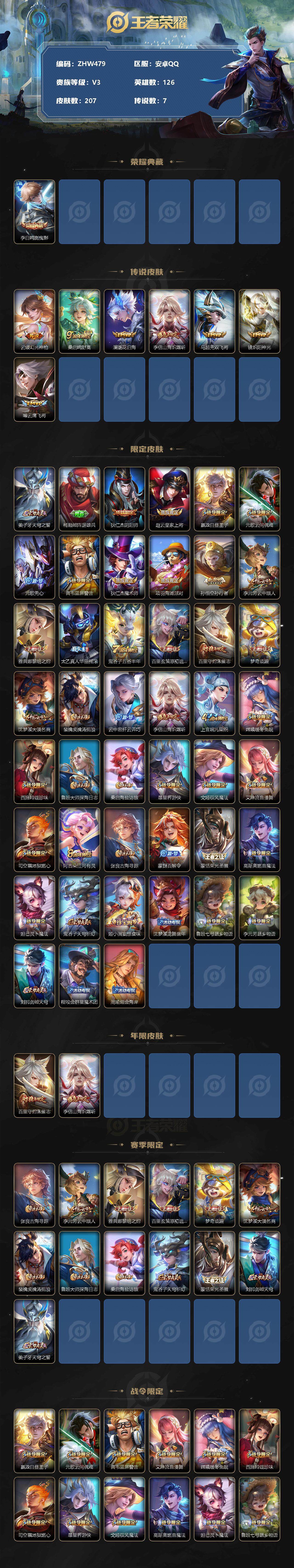[12489820]【特价急出/详情看图】:安卓Q-V3-最强王者段位-126英雄-207皮肤-1典藏-7传说-55史诗