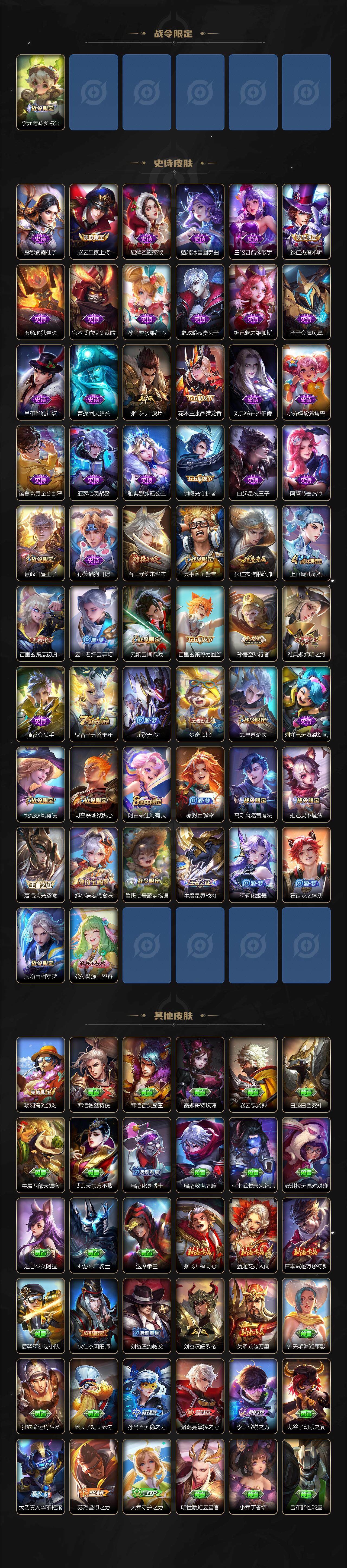 【史诗皮肤】:露娜紫霞仙子,赵云皇家上将,貂蝉圣诞恋歌,甄姬冰雪圆舞曲,王昭君偶像歌手,狄仁杰魔术师,廉颇地狱岩魂,宫本武藏鬼剑武藏,孙尚香水果甜心,嬴政暗夜贵公子,妲己魅力维加斯,墨子金属风暴,吕布圣诞狂欢,曹操幽灵船长,张飞乱世虎臣,花木兰水晶猎龙者,刘邦德古拉伯爵,小乔缤纷独角兽,诸葛亮黄金分割率,亚瑟心灵战警,雅典娜冰冠公主,铠曙光守护者,白起星夜王子,阿轲节奏热浪,嬴政白昼王子,孙策猫狗日记,百里守约朱雀志,典韦蓝屏警告,狄仁杰鹰眼统帅,上官婉儿梁祝,百里玄策原初追逐者,云中君纤云弄巧,元歌云间偶戏,百里玄策热力回旋,孙悟空孙行者,雅典娜黎明之约,澜赏金猎手,鬼