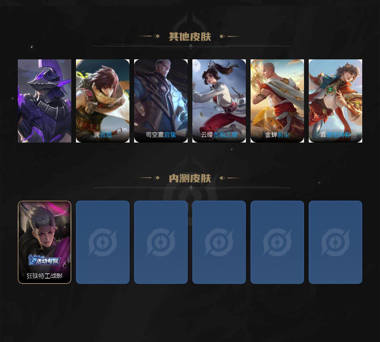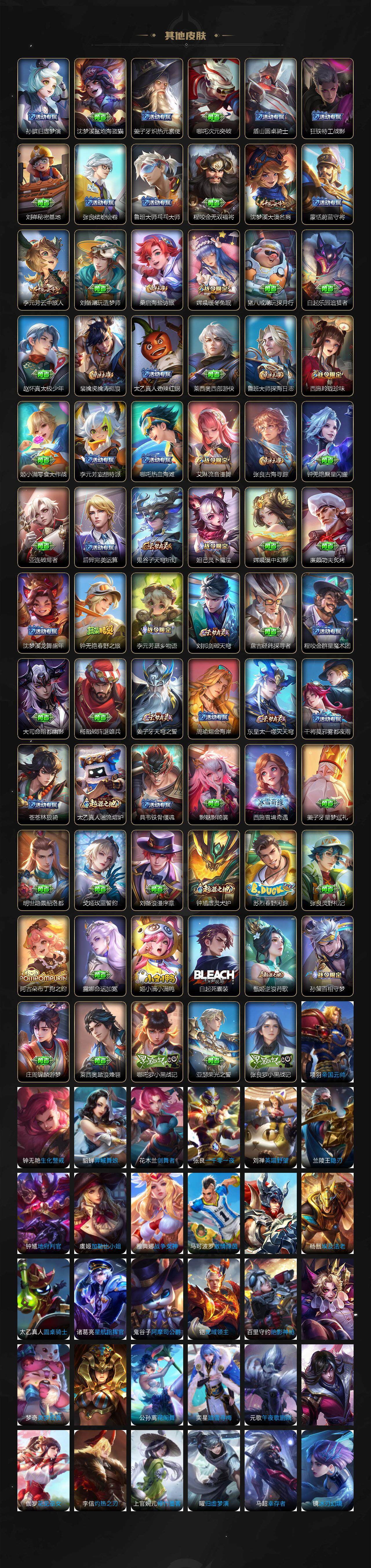 【限定皮肤】:姜子牙天穹之誓,杨戬破阵退雄兵,狄仁杰阴阳师,赵云皇家上将,嬴政白昼王子,元歌云间偶戏,元歌无心,典韦蓝屏警告,狄仁杰魔术师,项羽海滩派对,孙悟空孙行者,李元芳云中旅人,雅典娜黎明之约,太乙真人华丽摇滚,鬼谷子五谷丰年,百里玄策原初追逐者,百里守约朱雀志,梦奇顽趣,沈梦溪大漠名商,裴擒虎擒涛扼浪,云中君纤云弄巧,李信山海炽霜斩,上官婉儿梁祝,嫦娥暖冬兔眠,西施玲珑珍味,鲁班大师探海日志,桑启海盐诗旅,暃星界游侠,戈娅驭风魔法,艾琳流音漫舞,司空震地狱燃心,阿古朵江河有灵,张良古海寻踪,蒙犽百解令,蒙恬荣光圣徽,高渐离燃音魔法,妲己灵卜魔法,鬼谷子天穹祈灯,姬小满妄想食味,沈梦溪龙舞盛年,鲁班七号蔬乡物语,李元芳蔬乡物语,刘邦剑破天穹,程咬金群星魔术团,周瑜熔金海岸