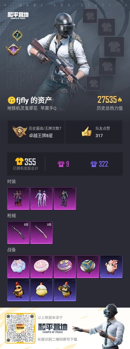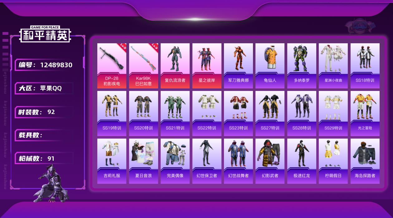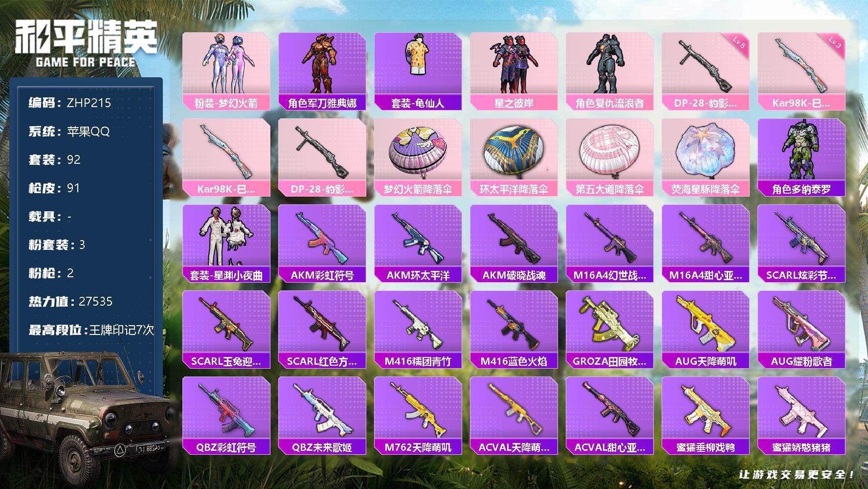 [12489830]地铁满天赋【特价急出/详情看图】:苹果 手Q-3粉装-2特效枪-2.7w热力值-7王牌印记-92套装-91枪皮【热门品类】:粉装-梦幻火箭,角色-军刀雅典娜,套装-龟仙人【粉色套装】:粉装-梦幻火箭,粉装-星之彼岸,角色-复仇流浪者【粉色枪皮等级】:Kar98K-巳巳如意(三级),DP-28-豹影疾电(五级)