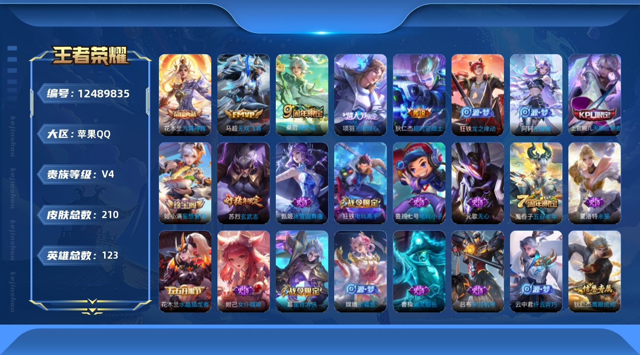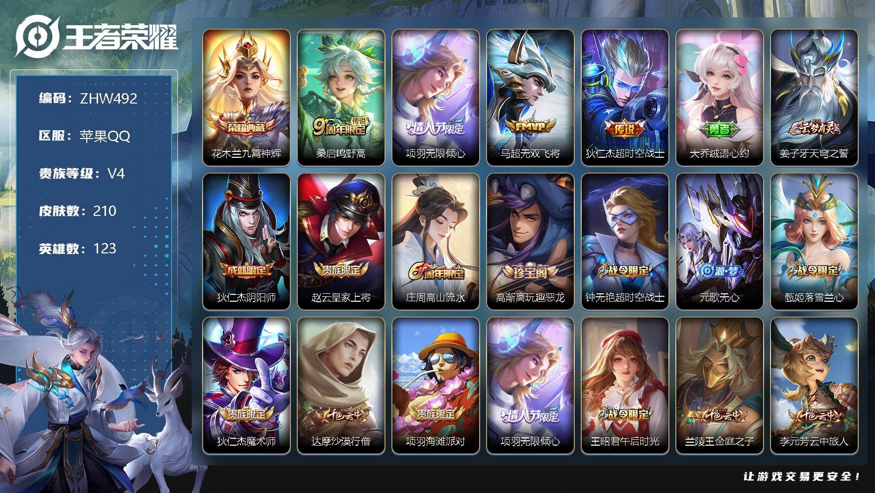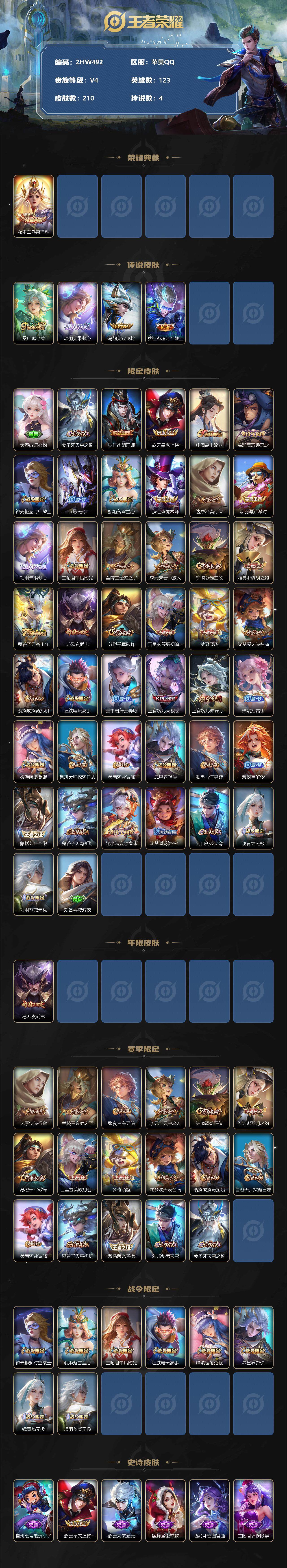 [12489835]【特价急出/详情看图】:苹果Q-V4-永恒钻石II段位-123英雄-210皮肤-1典藏-4传说-50史诗