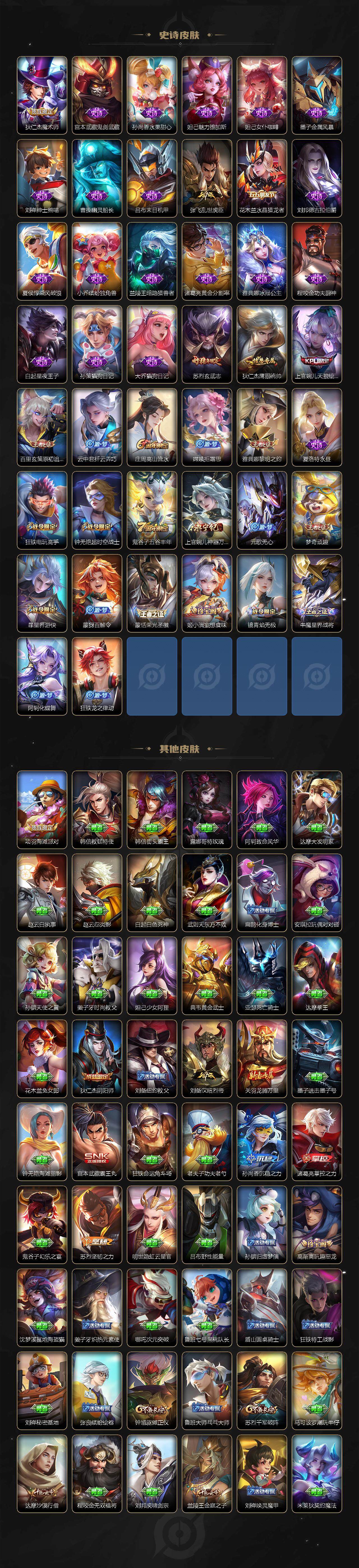 【史诗皮肤】:鲁班七号电玩小子,赵云皇家上将,赵云未来纪元,貂蝉圣诞恋歌,甄姬冰雪圆舞曲,王昭君偶像歌手,狄仁杰魔术师,宫本武藏鬼剑武藏,孙尚香水果甜心,妲己魅力维加斯,妲己女仆咖啡,墨子金属风暴,刘禅绅士熊喵,曹操幽灵船长,吕布末日机甲,张飞乱世虎臣,花木兰水晶猎龙者,刘邦德古拉伯爵,夏侯惇乘风破浪,小乔缤纷独角兽,兰陵王暗隐猎兽者,诸葛亮黄金分割率,雅典娜冰冠公主,程咬金功夫厨神,白起星夜王子,孙策猫狗日记,大乔猫狗日记,苏烈玄武志,狄仁杰鹰眼统帅,上官婉儿天狼绘梦者,百里玄策原初追逐者,云中君纤云弄巧,庄周高山流水,嫦娥拒霜思,雅典娜黎明之约,夏洛特永昼,狂铁电玩高手,钟无艳超时空战士,鬼谷子五谷丰年,上官婉儿神器万象笔,元歌无心,梦奇顽趣,暃星界游侠