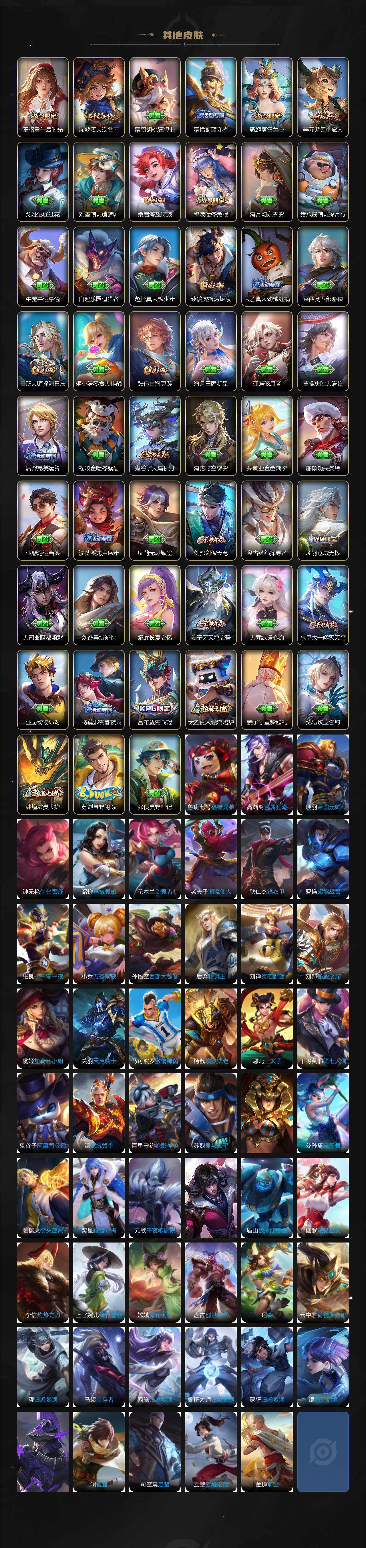 大乔猫狗日记,孙策猫狗日记,诸葛亮黄金分割率,王昭君偶像歌手,雅典娜冰冠公主,吕布末日机甲,鲁班七号电玩小子,刘禅绅士熊喵,白起星夜王子,程咬金功夫厨神,刘邦德古拉伯爵,兰陵王暗隐猎兽者,曹操幽灵船长,宫本武藏鬼剑武藏,小乔缤纷独角兽,夏侯惇乘风破浪,花木兰水晶猎龙者,墨子金属风暴,百里玄策原初追逐者,貂蝉圣诞恋歌,嫦娥拒霜思,雅典娜黎明之约,夏洛特永昼,蒙犽百解令