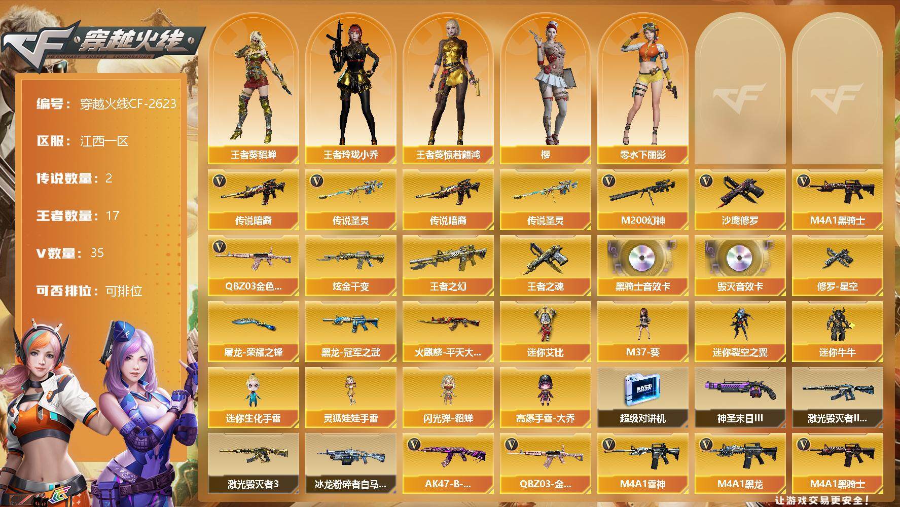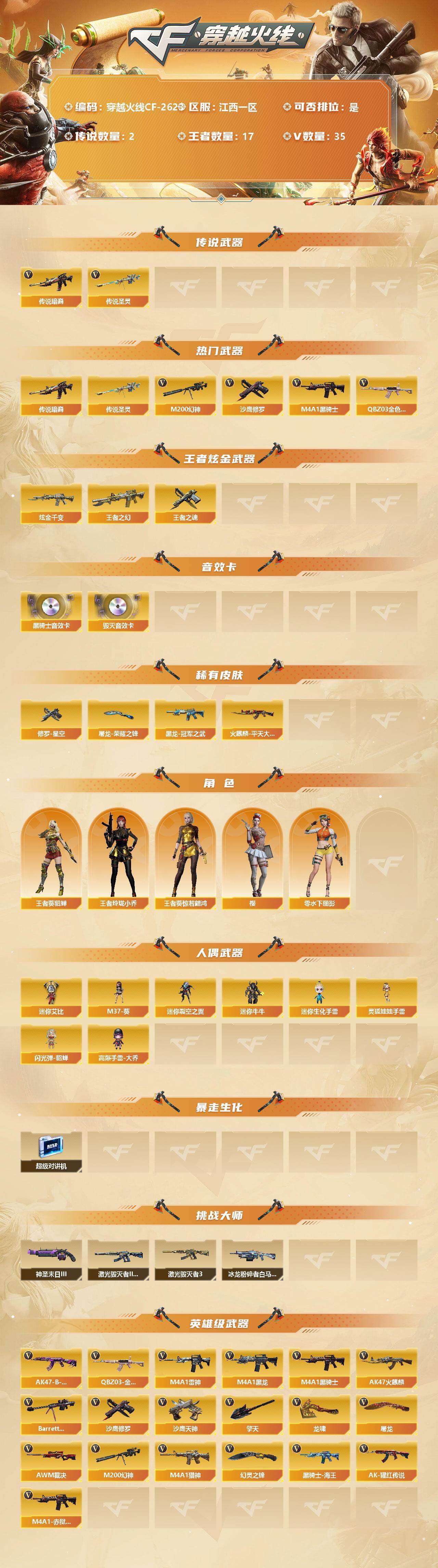 [12489860]【商品标题】:江西一区-35V-17王者-1炫金 【传说武器】:传说暗裔,传说圣灵 【热门武器】:传说暗裔,传说圣灵,QBZ03-金色蔷薇,M200-幻神,M4A1-黑骑士,沙鹰-修罗*2 【王者炫金武器】:炫金千变,王者之幻,王者之魂 【音效卡】:M4A1-黑骑士音效卡,Barrett-毁灭音效卡 【稀有皮肤】:火麒麟-平天大圣,黑龙-冠军之武,修罗-星空,屠龙-荣耀之锋 【角色】:王者-葵-貂蝉,王者葵-惊若翩鸿,王者玲珑-小乔,零-水下丽影,樱 【人偶武器】:M37-葵,迷你艾比,迷你裂空之翼,迷你牛牛,迷你生化手雷,灵狐娃娃手雷,闪光弹-貂蝉,高爆手雷-大乔 【暴走生化】:超级对讲机 【挑战大师】:神圣爆裂者-末日III,激光毁灭者III,激光毁灭者III-白马银枪,冰龙粉碎者-白马银枪 【英雄级武器】:幻灵之锋,QBZ03-金色蔷薇,M4A1-雷神,M4A1-黑龙,M4A1-黑骑士,AK47-火麒麟,Barrett-毁灭,AWM-裁决,M200-幻神,M4A1-猎神,黑骑士-海王,AK-47-猩红传说,AK47-B-常胜将军,M4A1-赤狱骑士,沙鹰-天神,沙鹰-修罗*2,擎天*2,龙啸,屠龙*2 【特殊枪械】:1黑骑士