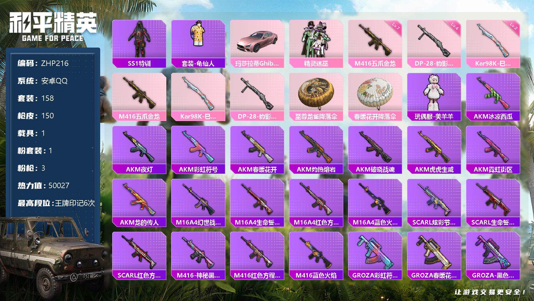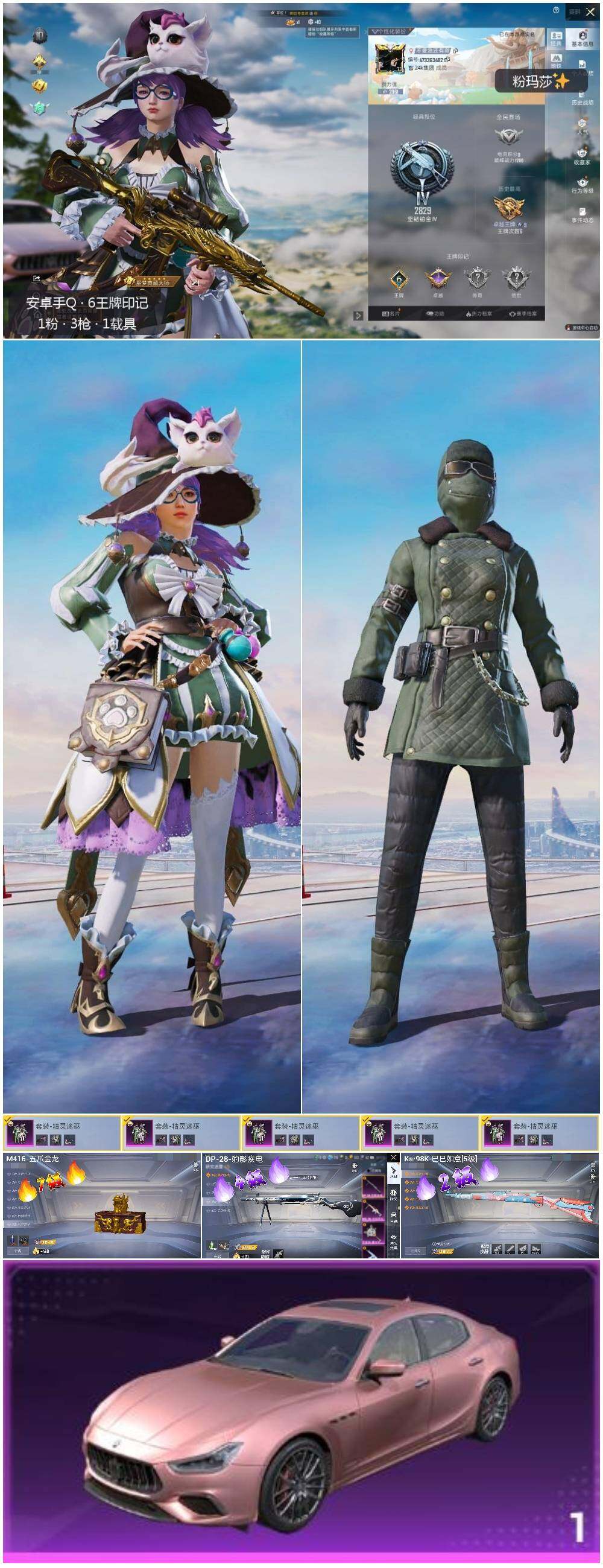 [12489880]【特价急出/详情看图】:安卓 手Q-1粉装-3特效枪-1载具-5w热力值-6王牌印记-158套装-150枪皮【热门品类】:套装-SS1特训,套装-龟仙人【粉色载具】:玛莎拉蒂Ghibli(粉)【粉色套装】:粉装-精灵迷巫【粉色枪皮等级】:M416-五爪金龙(七级),Kar98K-巳巳如意(二级),DP-28-豹影疾电(四级)