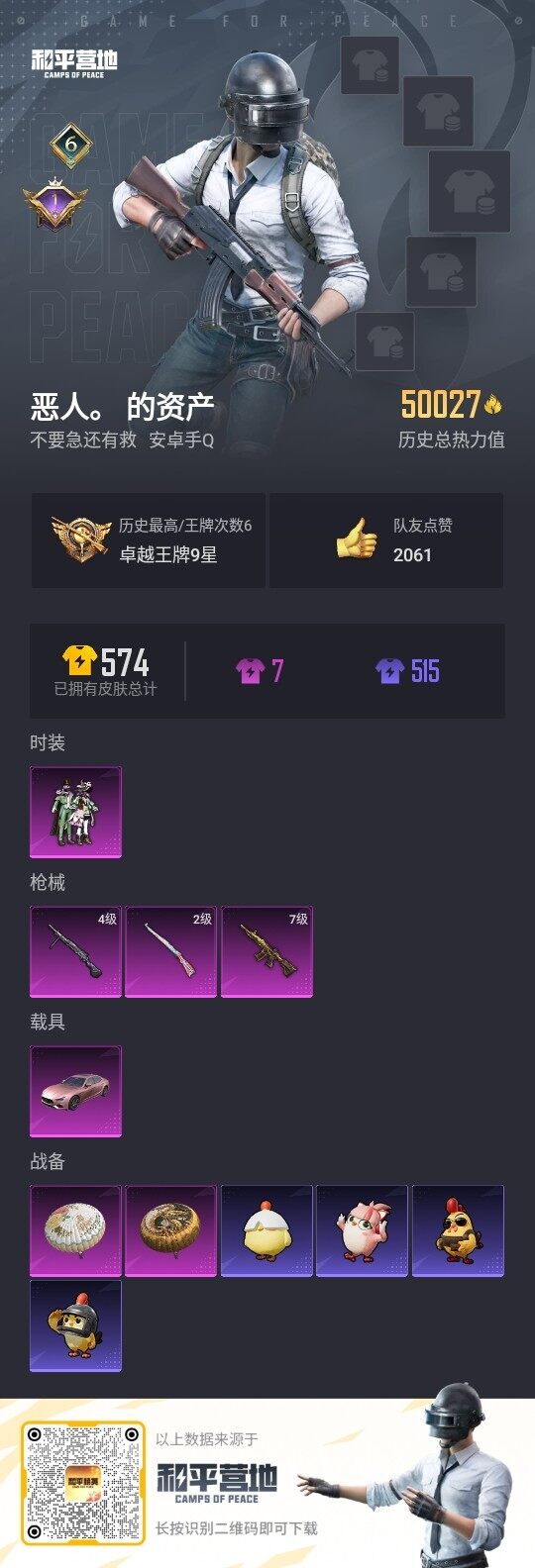 - PX_2096241- 苹果手Q-1王牌印记-2粉装-2特效枪-0载具-13214热力值-25套装-49枪皮-0卓越印记-0传奇印记 【2粉装】,荧海星豚,彩虹独角兽 【2特效枪】M416-风花雪月-3级 Kar98K-巳巳如意-5级 【25稀有时装】,SS31特训,SS33特训,SS32特训,蓝冰羽,雪绒豹,恋语绒绒,星渊小夜曲,SS34特训,紫幽梦,大橘大利,云朵鹅,风舞幻音,顶瓜瓜,星途旅