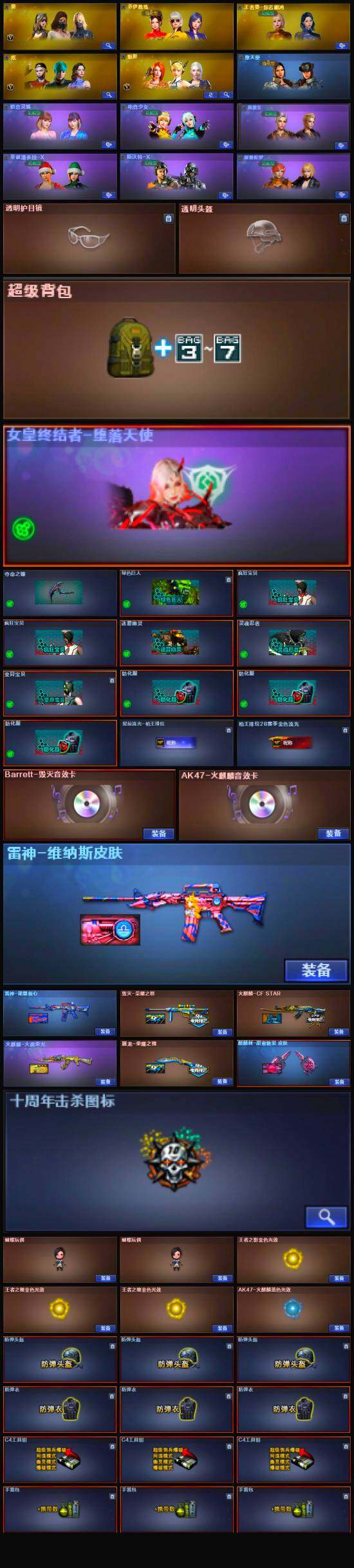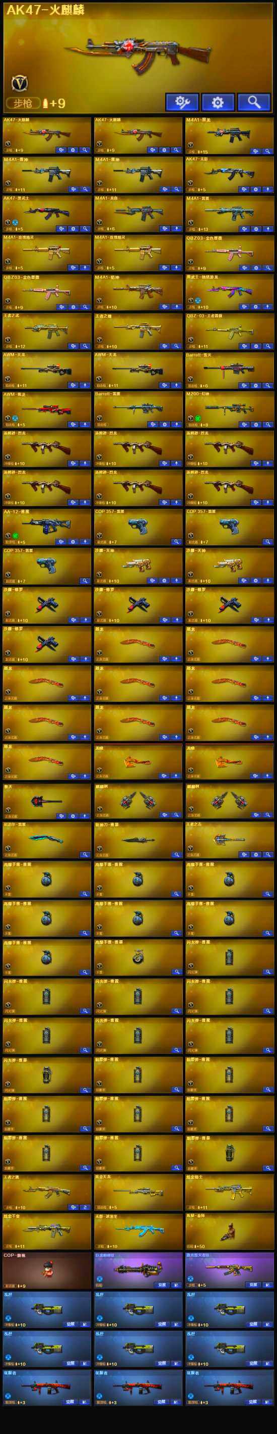 【英雄级武器】:斩神刀-雷暴,M4A1-雷霆,QBZ03-金色蔷薇*2,M4A1-雷神*2,M4A1-黑龙,M4A1-玫瑰精灵*2,汤姆逊-烈龙*6,AK47-无影,AK47-火麒麟*3,AK47-黑武士,AWM-天龙*2,Barrett-毁灭,AWM-裁决,M4A1-龙血,AA-12-雷霆,M200-幻神,M4A1-猎神,黑武士-锦绣游龙,沙鹰-天神*2,沙鹰-修罗*4,麒麟刺*2,擎天,龙啸*2,屠龙*9