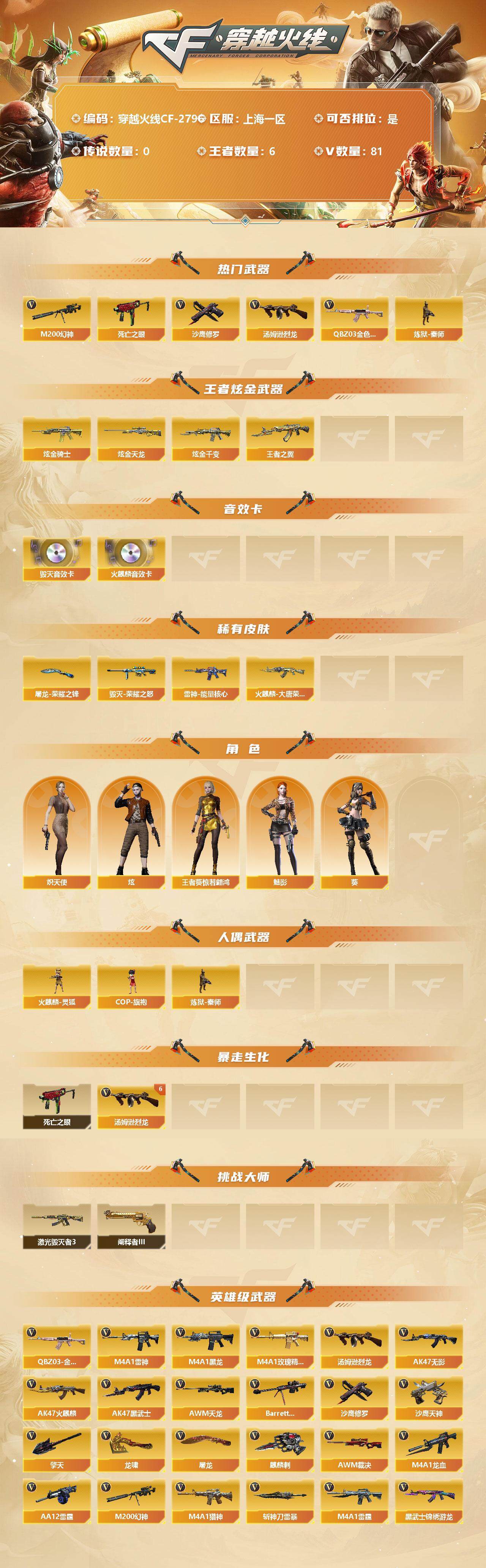 [12490339]【商品标题】:上海一区-81V-6王者-3炫金 【热门武器】:QBZ03-金色蔷薇*2,M200-幻神,死亡之眼,汤姆逊-烈龙*6,炼狱-秦师,沙鹰-修罗*4 【王者炫金武器】:炫金骑士,炫金天龙,炫金千变,王者之翼 【音效卡】:AK47-火麒麟音效卡,Barrett-毁灭音效卡 【稀有皮肤】:雷神-能量核心,火麒麟-大唐荣光,毁灭-荣耀之怒,屠龙-荣耀之锋 【角色】:王者葵-惊若翩鸿,葵,魅影,炫,炽天使 【人偶武器】:炼狱-秦师,火麒麟-灵狐,COP-旗袍 【暴走生化】:死亡之眼 【挑战大师】:阐释者III,激光毁灭者III 【英雄级武器】:斩神刀-雷暴,M4A1-雷霆,QBZ03-金色蔷薇*2,M4A1-雷神*2,M4A1-黑龙,M4A1-玫瑰精灵*2,汤姆逊-烈龙*6,AK47-无影,AK47-火麒麟*3,AK47-黑武士,AWM-天龙*2,Barrett-毁灭,AWM-裁决,M4A1-龙血,AA-12-雷霆,M200-幻神,M4A1-猎神,黑武士-锦绣游龙,沙鹰-天神*2,沙鹰-修罗*4,麒麟刺*2,擎天,龙啸*2,屠龙*9 【特殊枪械】:6烈龙