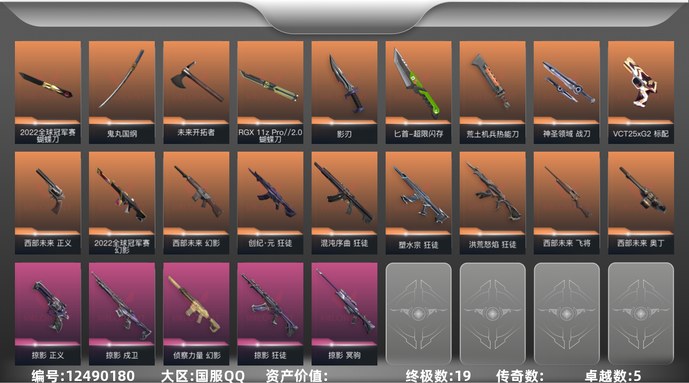 [12490180]【套装】:2022全球冠军赛套装,西部未来套装,掠影套装 【英雄】:幻棱,炼狱,维斯,暮蝶,钛狐,壹决,铁臂,捷风,雷兹,幽影,不死鸟,贤者,猎枭,蝰蛇,零,芮娜,奇乐,尚勃勒,霓虹,斯凯,夜露,星礈,K/O,海神,盖可,黑梦,钢锁 【近战 武器】:近战武器-2022全球冠军赛 蝴蝶刀,近战武器-RGX 11z Pro//2.0 蝴蝶刀,近战武器-鬼丸国纲,近战武器-未来开拓者,近战武器-超限闪存 匕首,近战武器-荒土机兵 热能刀,近战武器-影刃,近战武器-神圣领域 战刀 【狂徒】:狂徒-洪荒怒焰,狂徒-混沌序曲,狂徒-塑水宗,狂徒-创·纪元,狂徒-掠影,狂徒-荒土机兵 【幻影】:幻影-2022全球冠军赛,幻影-西部未来,幻影-侦察力量,幻影-超限闪存,幻影-神圣领域,幻影-纳米打击,幻影-西部未来 【戍卫】:戍卫-掠影,戍卫-浮光跃金,戍卫-逆冲蛮牛,戍卫-月球哨兵 【獠犬】:獠犬-神圣领域,獠犬-模拟赫兹,獠犬-逆冲蛮牛 【冥驹】:冥驹-掠影,冥驹-荒土机兵,冥驹-模拟赫兹,冥驹-星云暗涌 【飞将】:飞将-西部未来 【莽侠】:莽侠-超限闪存,莽侠-月球哨兵 【战神】:战神-神圣领域,战神-浮光跃金 【奥丁】:奥丁-西部未来,奥丁-纳米打击 【判官】:判官-纳米打击x 【雄鹿】:雄鹿-模拟赫兹,雄鹿-逆冲蛮牛,雄鹿-月球哨兵 【骇灵】:骇灵-荒土机兵,骇灵-浮光跃金,骇灵-星云暗涌 【蜂刺】:蜂刺-超限闪存,蜂刺-星云暗涌 【标配】:标配-荒土机兵,标配-浮光跃金 【VCT手枪】:标配-VCT25 x G2 【正义】:正义-西部未来,正义-掠影,正义-超限闪存,正义-纳米打击,正义-月球哨兵 【鬼魅】:鬼魅-诡秘蛇影,鬼魅-模拟赫兹,鬼魅-星云暗涌 【狂怒】:狂怒-神圣领域,狂怒-逆冲蛮牛 【卡面】:终章:激斗汉堡 卡面,进入射程 卡面,分崩离析 卡面,纳米打击 卡面,抑制技术 卡面,激斗汉堡 卡面,瓦娃脸雪糕 P2 卡面,从黄昏到黎明 卡面,荒土机兵 卡面,银弹猎手 卡面,逆冲蛮牛 卡面,《双城之战》拥抱 卡面,精灵大战 卡面,欢迎来到底城 卡面,南瓜盛典 卡面,唱片的故事 卡面,钢弓与箭弦 卡面,排除故障 卡面,战术桌游 卡面,悠享食光 卡面,修车达人 卡面,模拟赫兹 卡面,浮光跃金 卡面,超限闪存 卡面,维斯工牌 卡面,正义的化身 卡面,梦幻奶茶 卡面,西