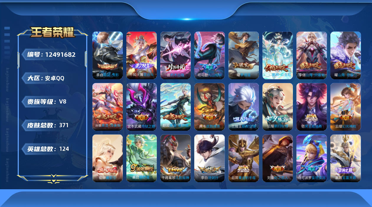 [12491682]【商品标题】:安卓Q-V8-最强王者段位-124英雄-371皮肤-1典藏-0珍品无双-1无双-1珍品传说-25传说-102史诗