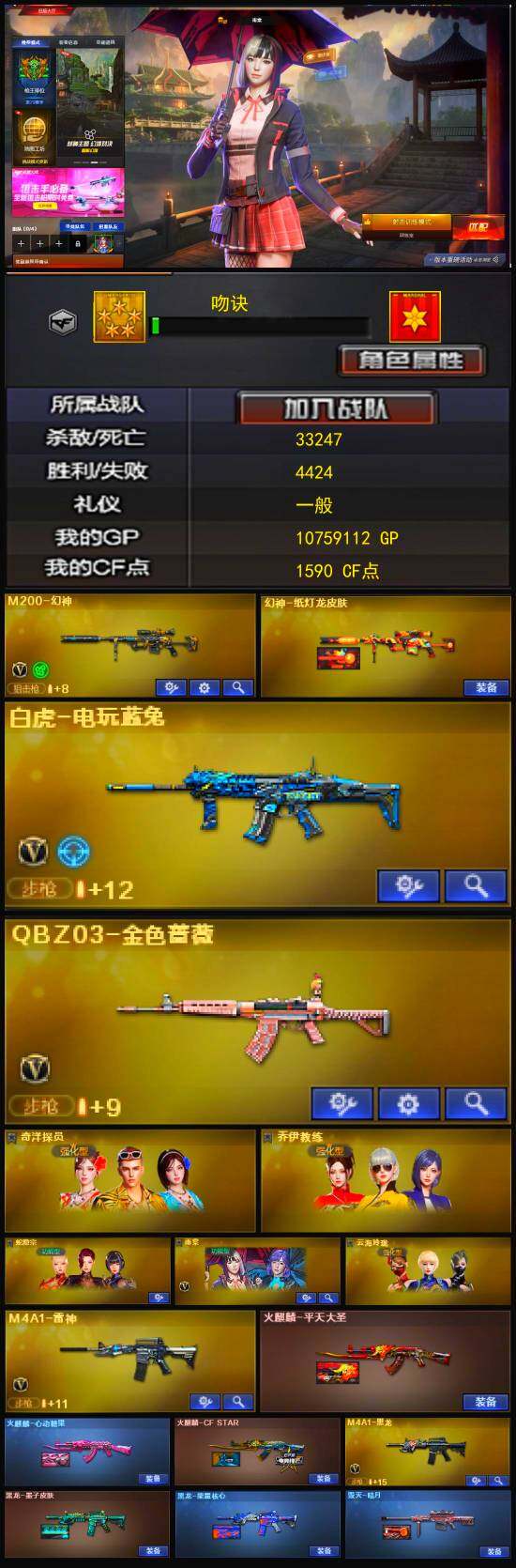 - [13080667]河南一区-34V-1王者-0炫金 【热门武器】:QBZ03-金色蔷薇,HK417-朱雀,M200-幻神*2,修罗-古蛇迷踪,白虎-电玩蓝兔,柯尔特-冠军之特,Cat-刀锋,沙鹰-修罗 【音效卡】:Barrett-毁灭音效卡,QBZ03-金色蔷薇音效卡 【皮肤】:M200-幻神-黄忠皮肤,幻神-巅峰荣耀,幻神-动感闪耀 皮肤,雷神-冠军之魄,雷神-宇航兔皮肤,雷神-源计划2.0专属 皮肤,毁灭-冠军之怒,毁灭-风暴,战神-粉色甜心皮肤*2,战神-流金岁月皮肤,AK47-B-常胜将军-孙权*3,修罗-15周年嘉年华 皮肤 【角色】:雨棠,战地猎狐,蛇隐宗,乔伊教练,铁骑荣耀 【人偶武器】:火麒麟-灵狐,AWM-灵狐-15周年嘉年华,Cat-刀锋,迷你超能女侍,迷你裂空之翼 【挑战大师】:冰龙粉碎者-白马银枪*3,神圣爆裂者-末日III 【英雄级武器】:AK47-火麒麟,M4A1-雷神,AN94-超新星,HK417-朱雀,无影-神兵利器,黑武士-锦绣游龙,QBZ03-金色蔷薇,烈火-动感闪耀,AK-47-猩红传说,AK47-B-战神,AK47-B-常胜将军,王者白虎-觉醒版,白虎-电玩蓝兔,Barrett-毁灭,M200-幻神*2,沙鹰-修罗,柯尔特-冠军之特,天神-动感闪耀,修罗-古蛇迷踪,屠龙,屠龙-动感闪耀,高爆手雷-神工天巧*2,手雷-动感闪耀,高爆手雷-古蛇迷踪,闪光弹-神工天巧*2,烟雾弹-神工天巧*2,烟雾弹-古蛇迷踪,M4A1-赤狱骑士 【特殊枪械】: